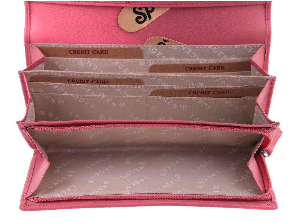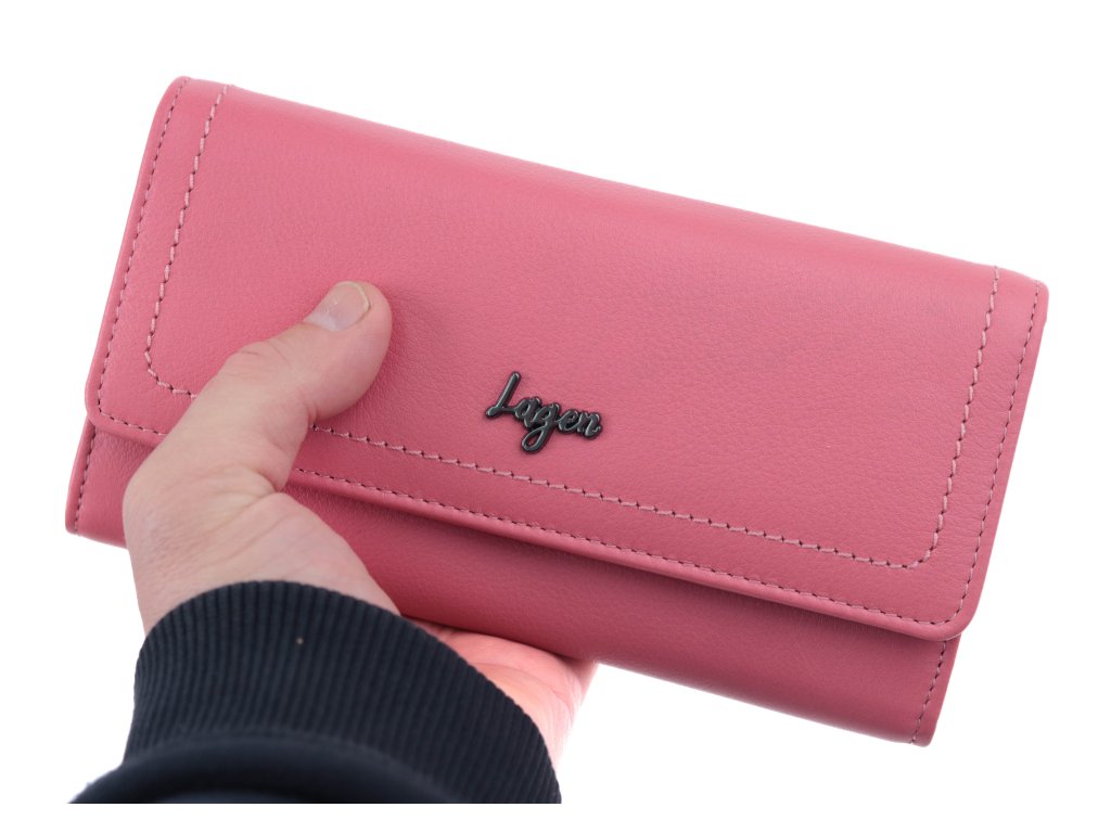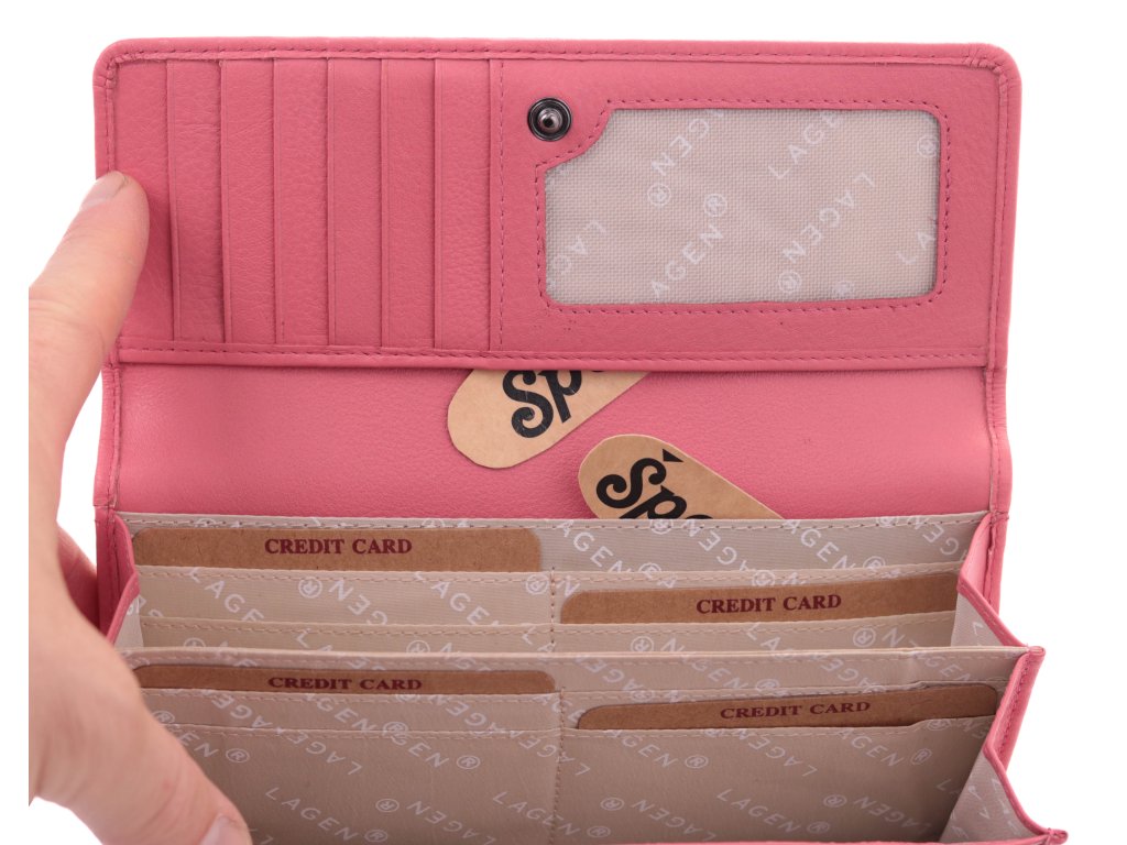 Dámská kožená peněženka klasického tvaru z hladké kůže obsahuje dostatečné množství přihrádek na vaše karty doklady, bankovky, peníze a další nezbytnosti. Značka Lagen je zárukou kvality.