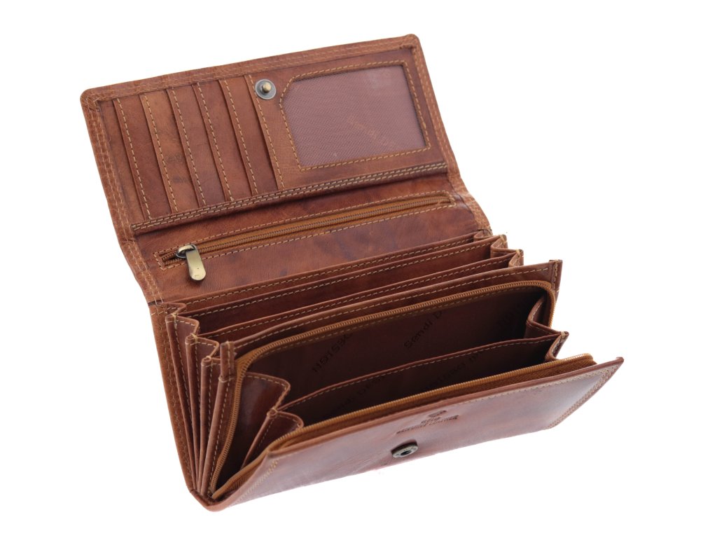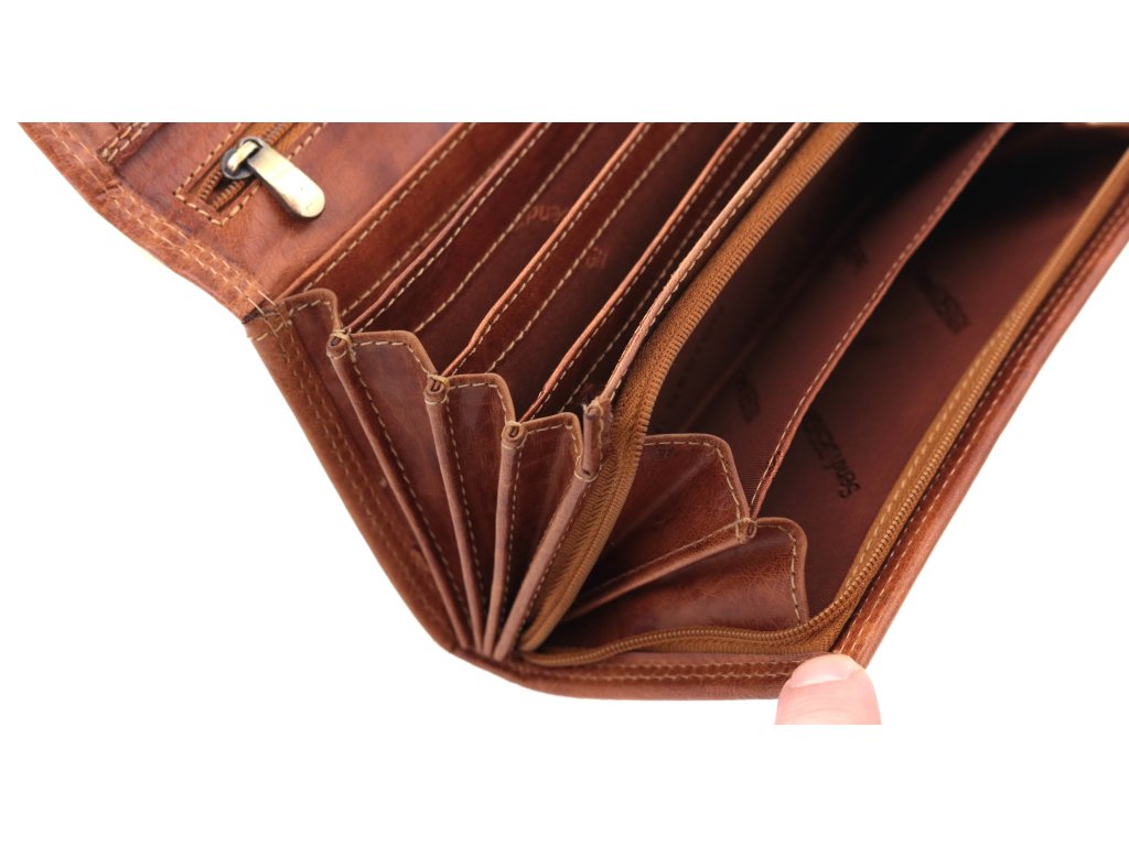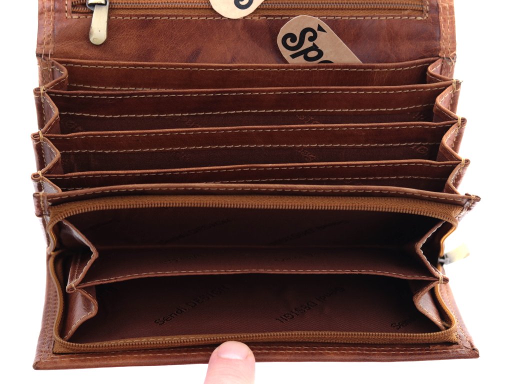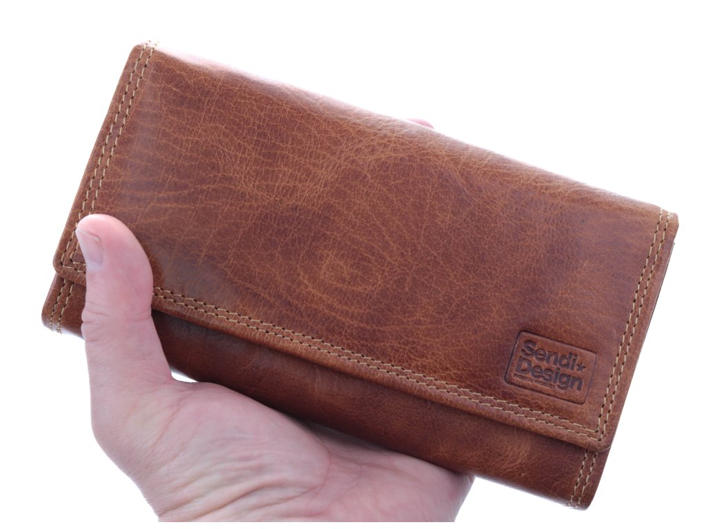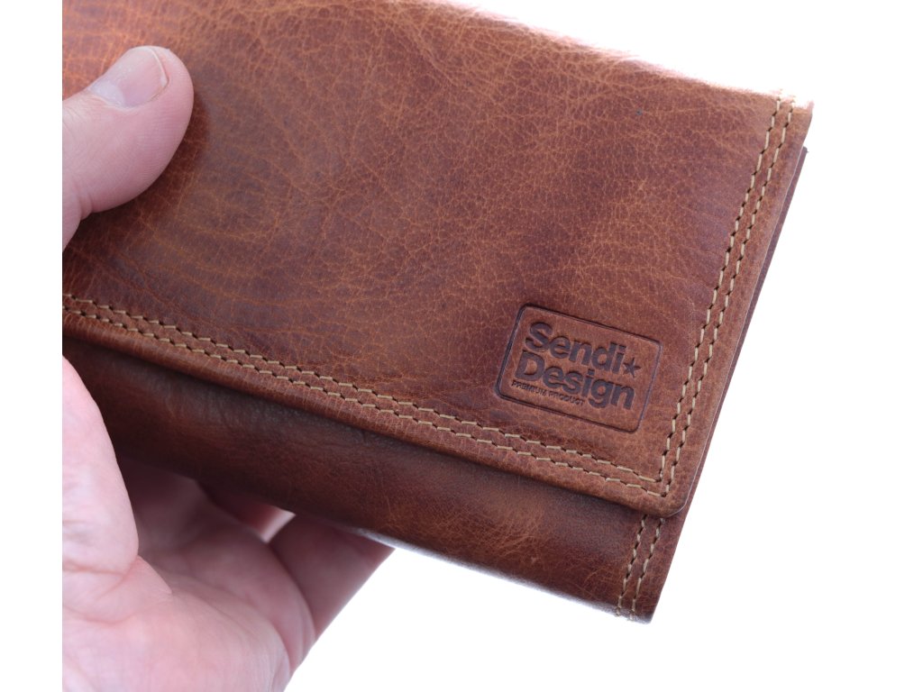 Velice odolná a houževnatá dámská peněženka od značky Sendi Design. Peněženka je zhotovená ze silnější voskované/anilinové hovězí usně. Voskované a olejované usně jsou populární pro svůj rustikálnější vzhled povrchu a jeho živý charakter. Živý charakter tohoto domašťovaného povrchu se vyznačuje například tím, že případný jemný škrábanec se dá zacelit teplým bříškem prstu. Povrchová úprava usně je fixovaná pomocí jemných vosků a olejů. Dlouhodobé nošení výrobků z těchto kůží vytváří na jejich povrchu neopakovatelnou patinu pravé kůže, která je mezi zákazníky velmi populární. Výrobky z voskovaných nebo olejovaných kůží velice dobře odolávají povětrnostním vlivům díky jejich voděodolnosti. Peněženka se vyznačuje velice velkorysým mincovníkem a velkým počtem přihrádek na bankovky.