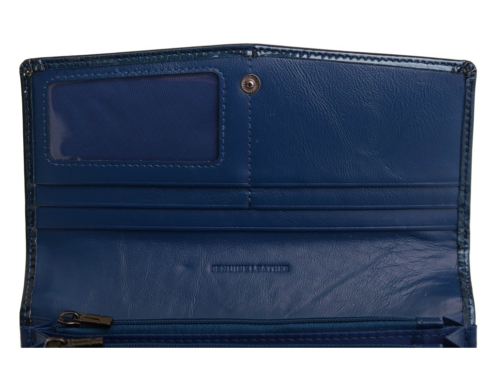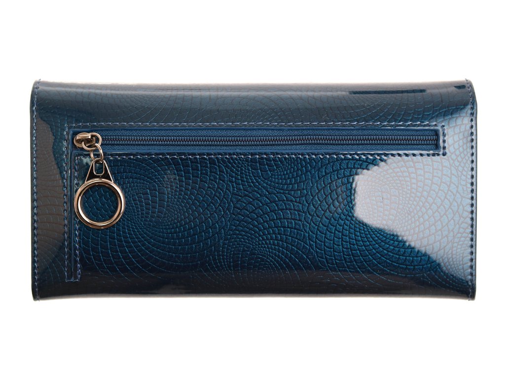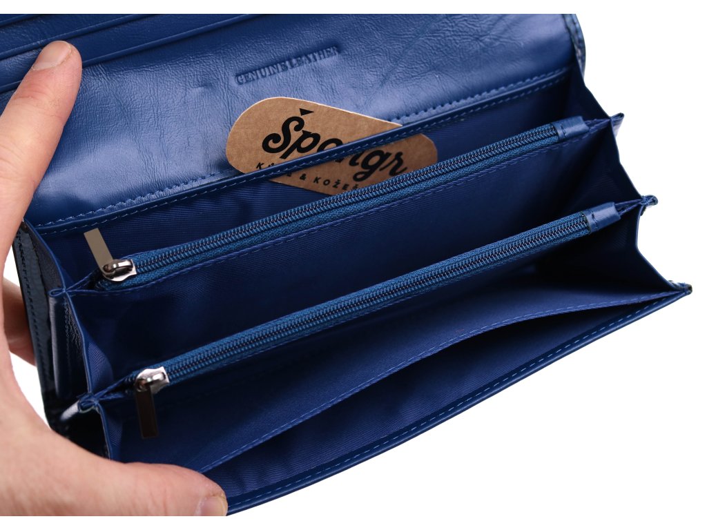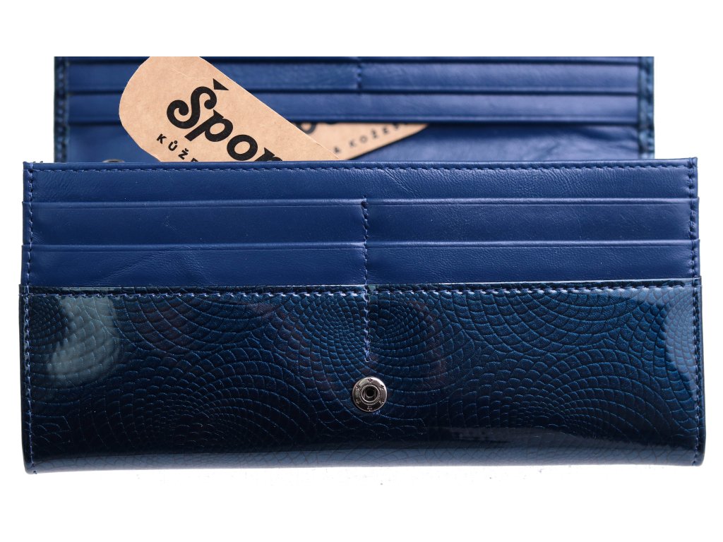 Krásná dámská kožená peněženka v modré barvě podtržené lakovanou povrchovou úpravou, která je opravdu nezničitelná. Velmi dobře vybavená a prostorná peněženka s velkým množstvím přihrádek a vnitřní kapsou na zip.