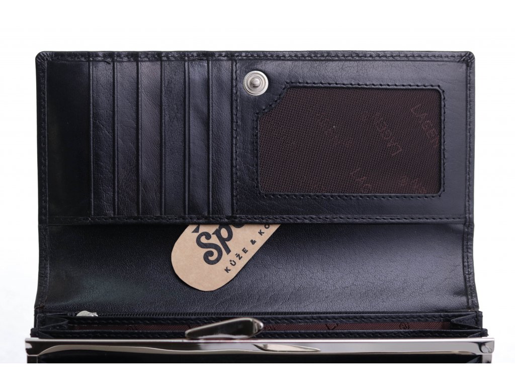Krásná a velká kožená peněženka je uvnitř opatřena rámečkem. Je dostatečně prostorná a uložíte do ní velké množství kartiček, dokladů a bankovek.