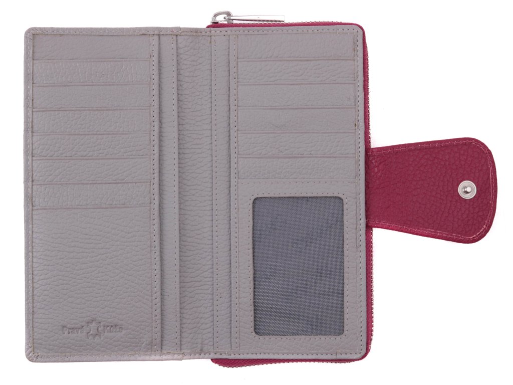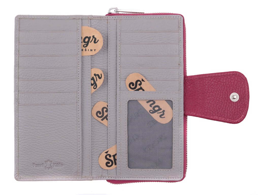 Do této hezké peněženky se toho vejde opravdu hodně. Extra velké množství karet, dokladů a drobností zůstává přehledně uspořádáno díky dvou odděleným prostorům. Jeden je na peníze a druhý na doklady, karty a kartičky všeho druhu.