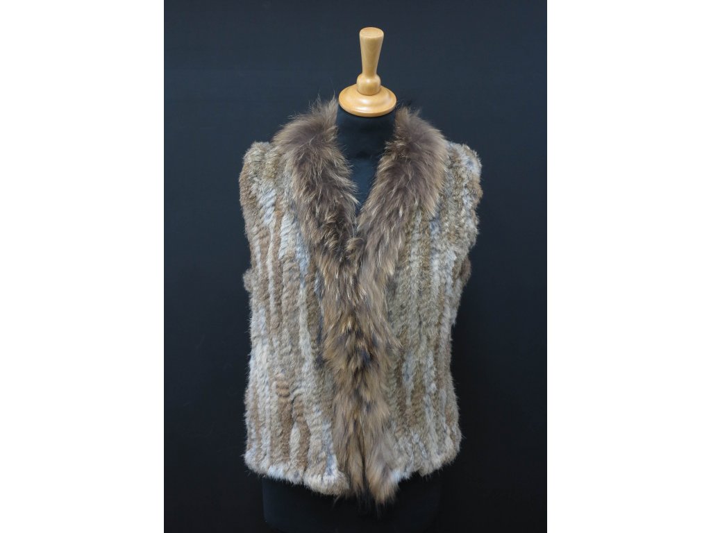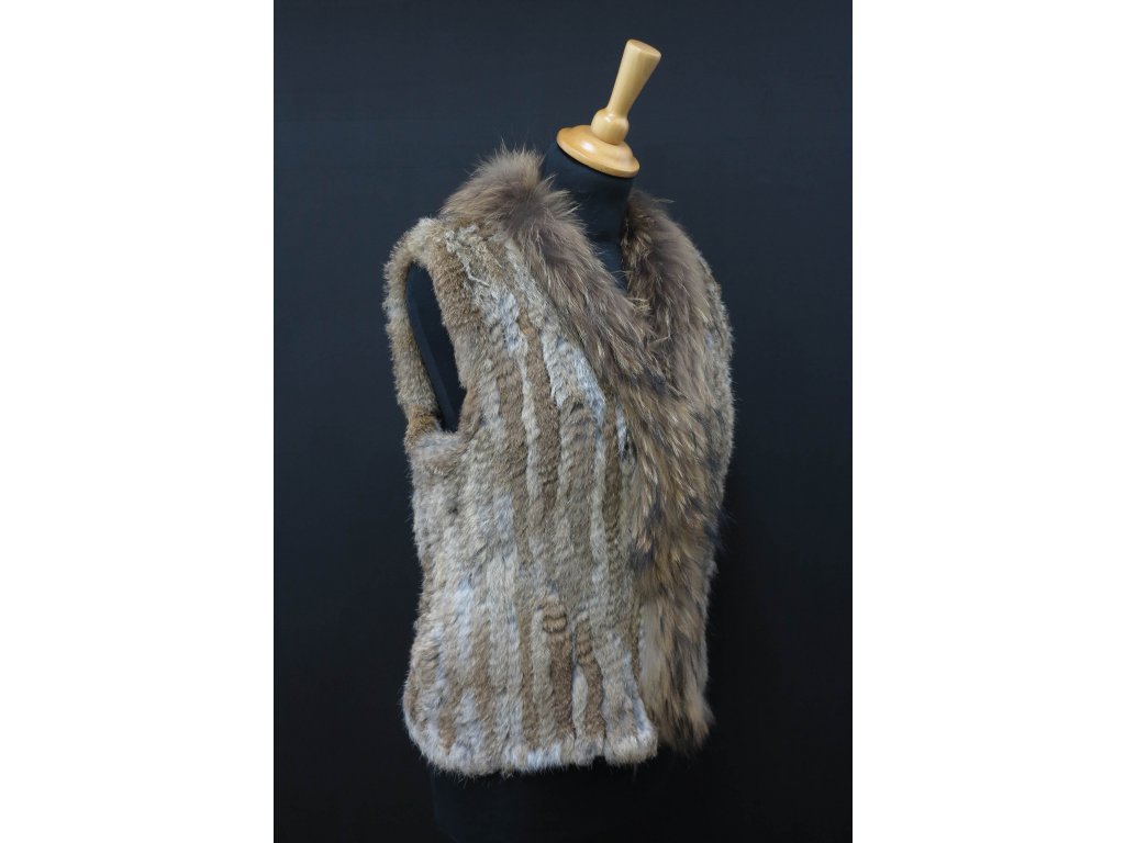 Módní krátká kožešinová vestička z šedé králičí kožešiny zdobená mývalovcem. Králičí kožešina je vetkaná do textilní osnovy.