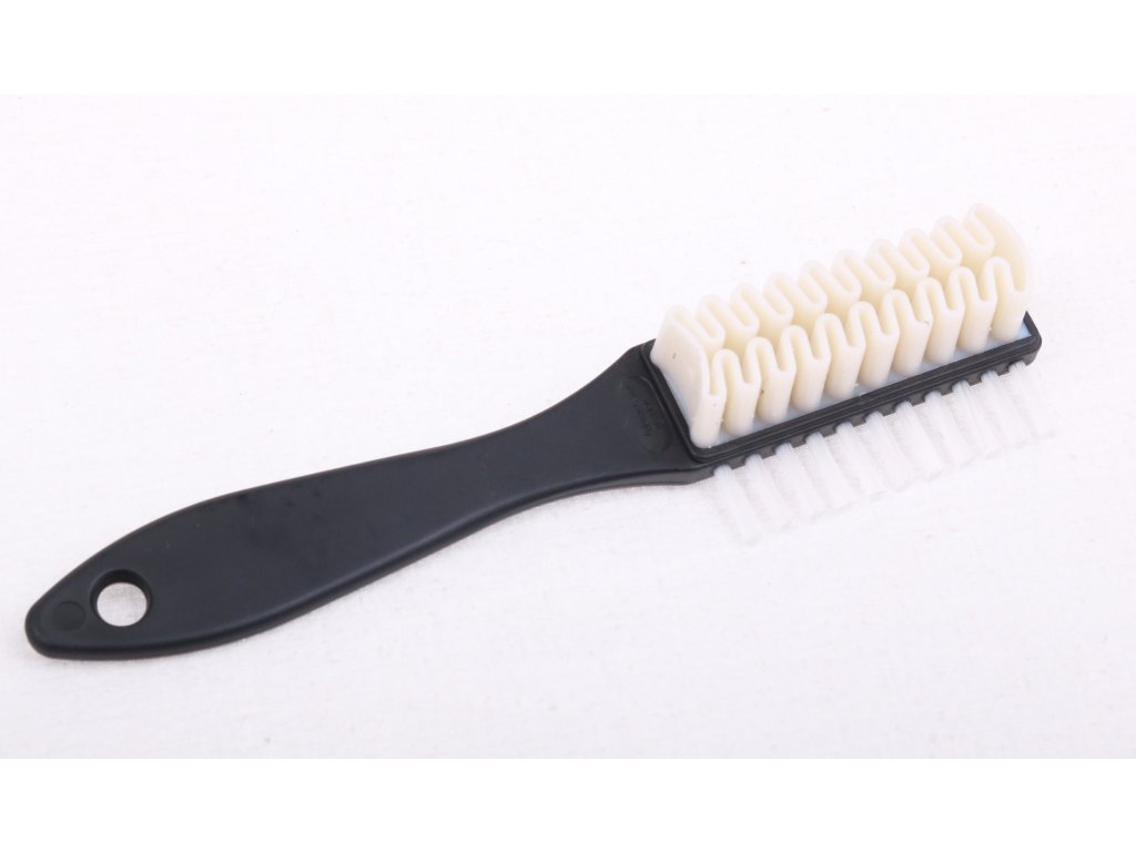 Kaučukový krepový kartáč je určen k suchému čištění a vyčesávání velurových a broušených usní povětšinou na obuvi. Velur/šemiš je tzv. vlasová useň, která potřebuje čas od času rozčesat pro udržení krásného vzhledu povrchu. Krepová část kartáče je vyrobena z kaučuku. Podélně umístěný plochý perlonový kartáček slouží k čištění těžce přístupných míst obuvi. Používá se i k vyčesávání vlasu usně po použití prostředků Nubuk+Velours sprej a Nubuk+Textil.