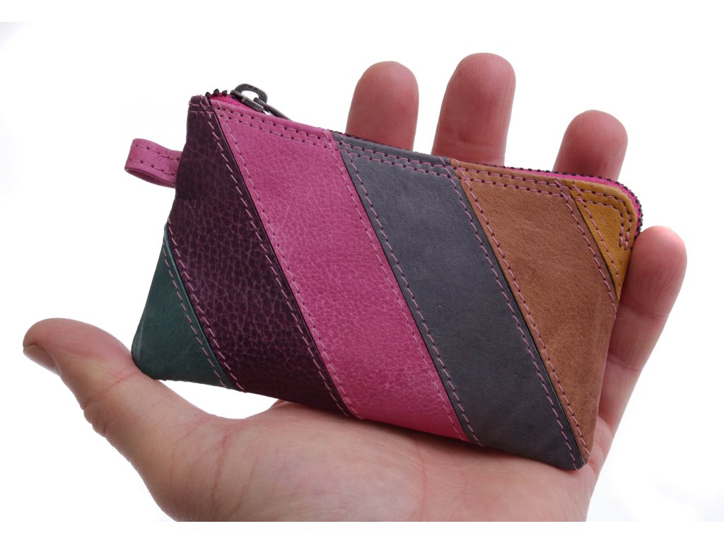 Veselá barevná kožená klíčenka na zip se dvěma kovovými kroužky. Na zadní straně má klíčenka malou kapsičku na zip.