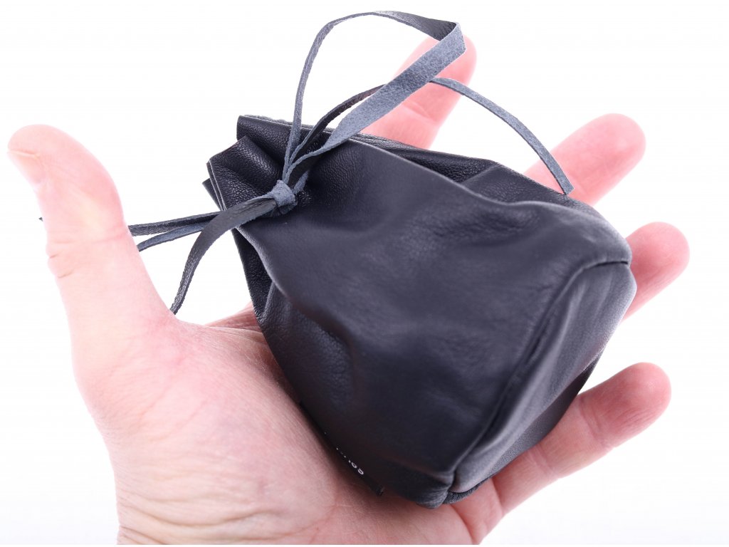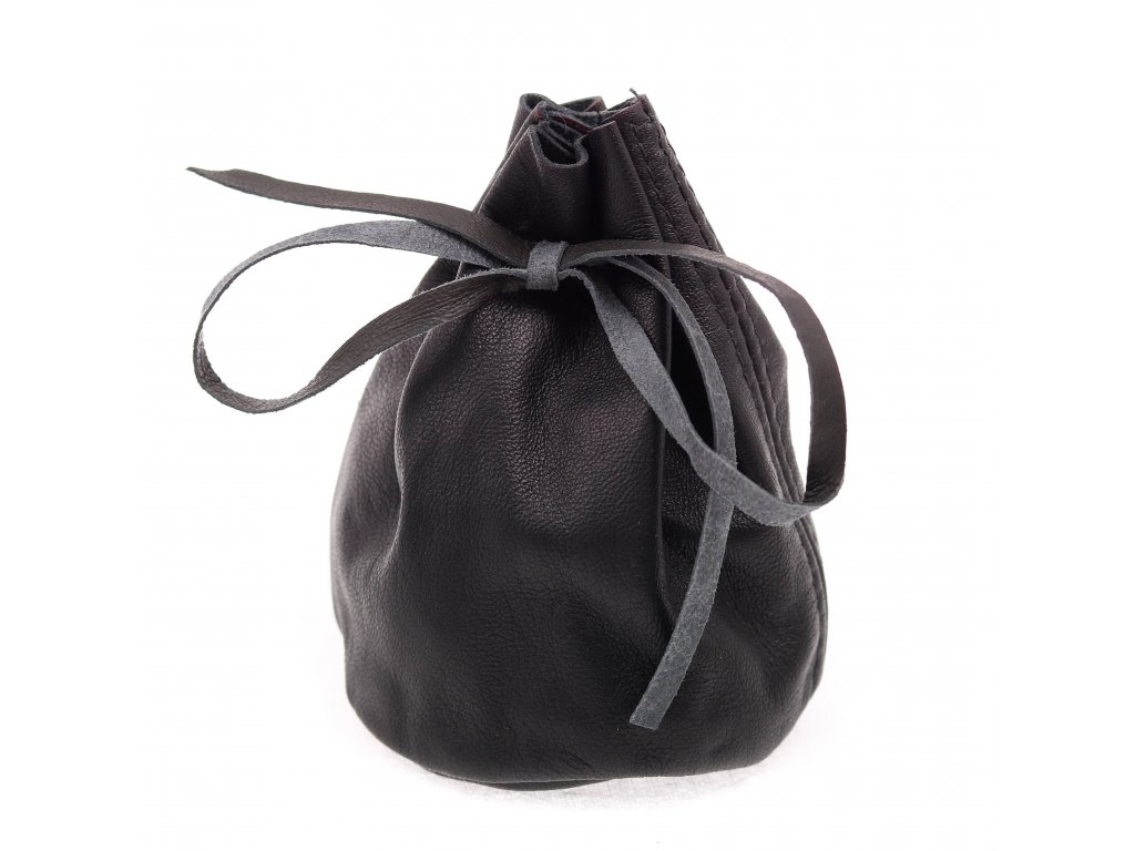 Malý kožený měšec vyrobený z kvalitní hladké kůže (skopovice) v černé barvě. Je opatřený stahováním na kožený řemínek.