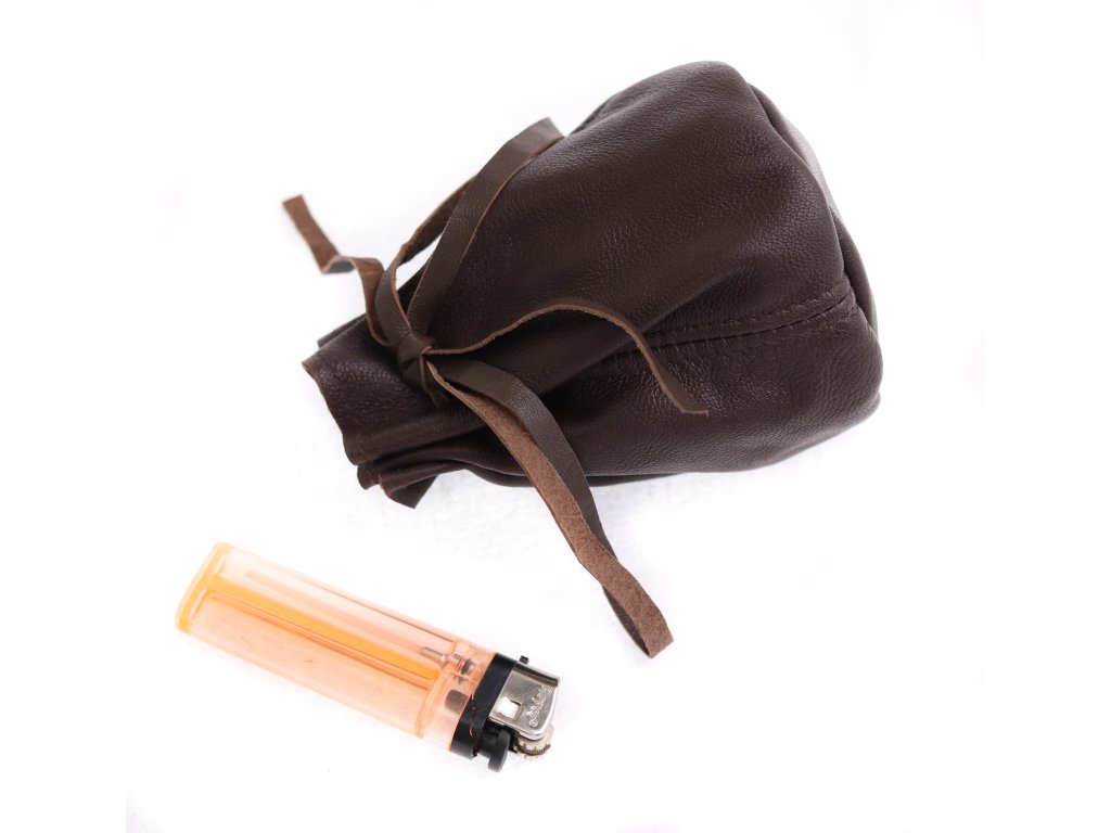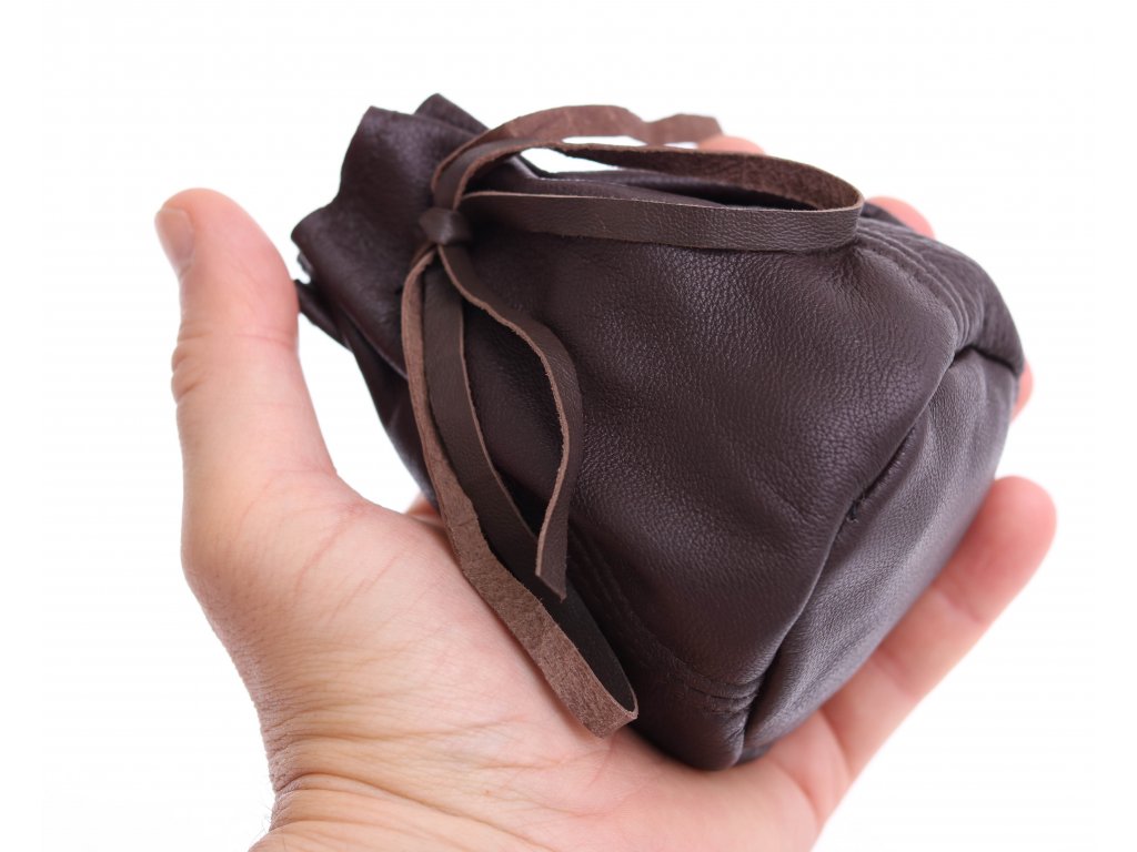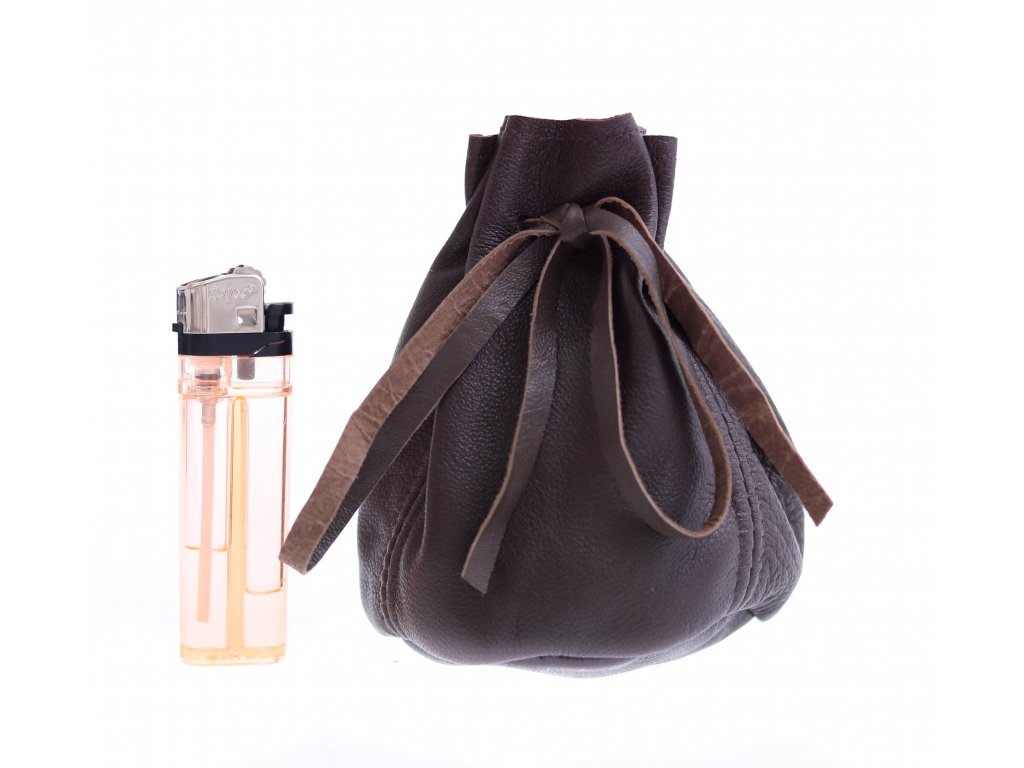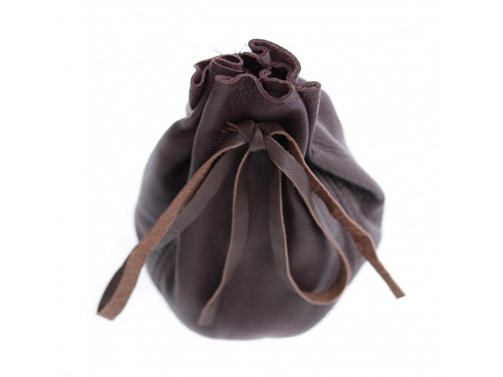Malý kožený měšec vyrobený z kvalitní hladké kůže (skopovice) v tmavě hnědé barvě. Je opatřený stahováním na kožený řemínek.