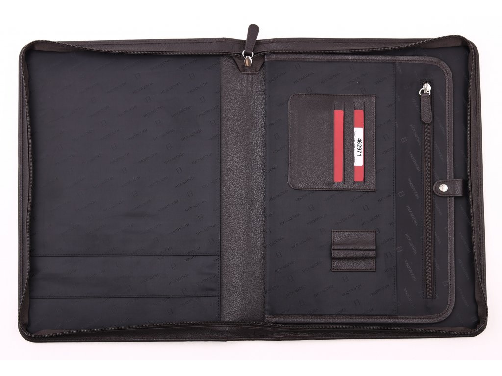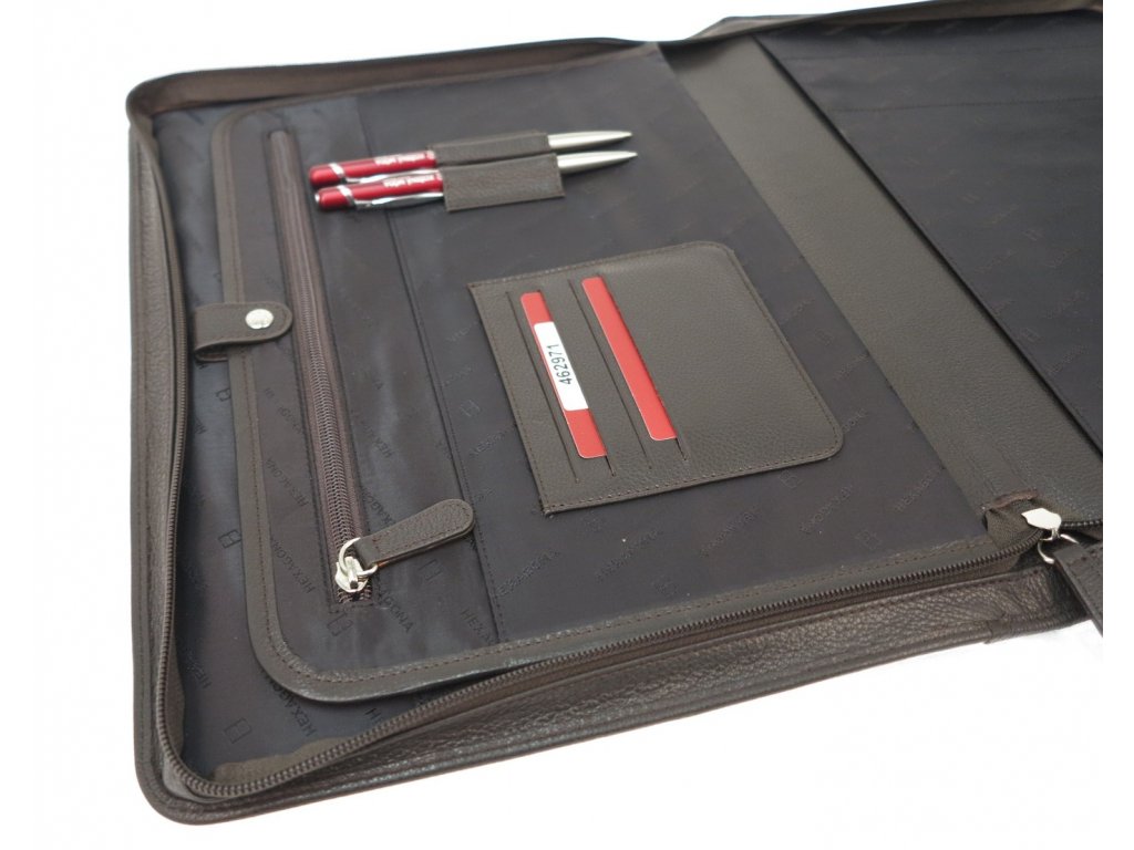Kvalitní kožená spisovka na dokumenty A4 a na počítač pojme vše nejnutnější pro vaše obchodní schůzky. Tato spisovka má pevné vypolstrované desky, takže je bezpečná pro uložení počítače o velikosti 13''.