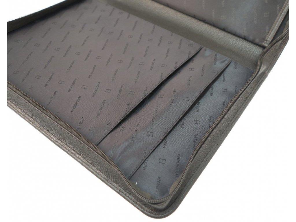 Černá kůže se středně výraznou kresbou a polomatným povrchem skvěle doplňuje hnědá textilní podšívka s logem Hexagona. Značka Hexagona vyrábí odolné a precizně zpracované kožené výrobky s důrazem na kvalitu komponentů.
