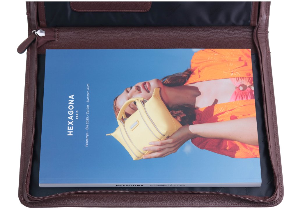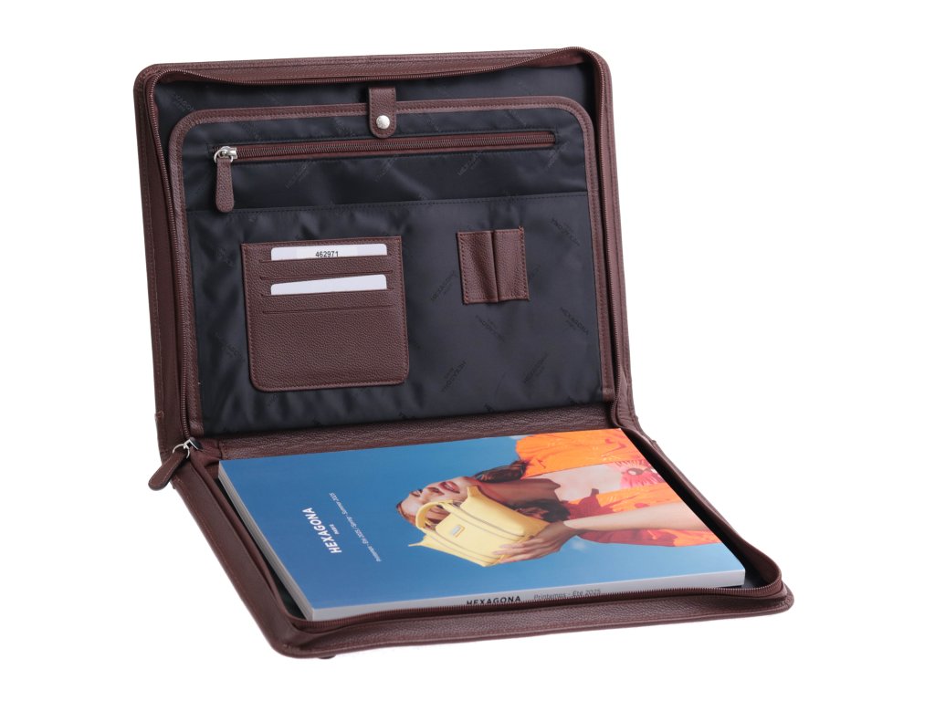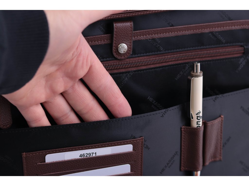 Hnědá kůže se středně výraznou kresbou a polomatným povrchem skvěle doplňuje hnědá textilní podšívka s logem Hexagona. Značka Hexagona vyrábí odolné a precizně zpracované kožené výrobky s důrazem na kvalitu komponentů.