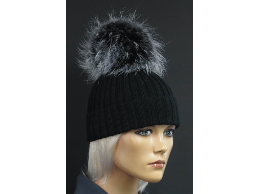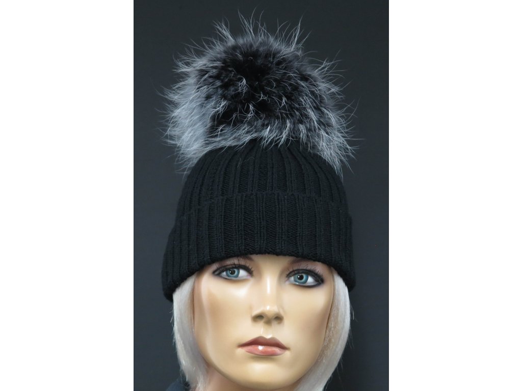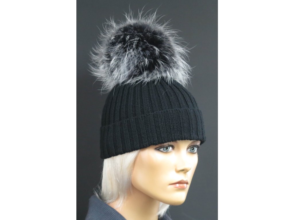 Luxusní ručně pletená čepice s kožešinovou bambulí 693 černá