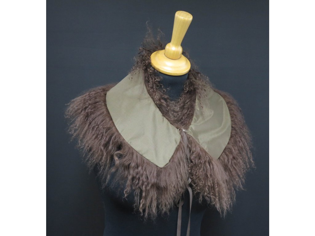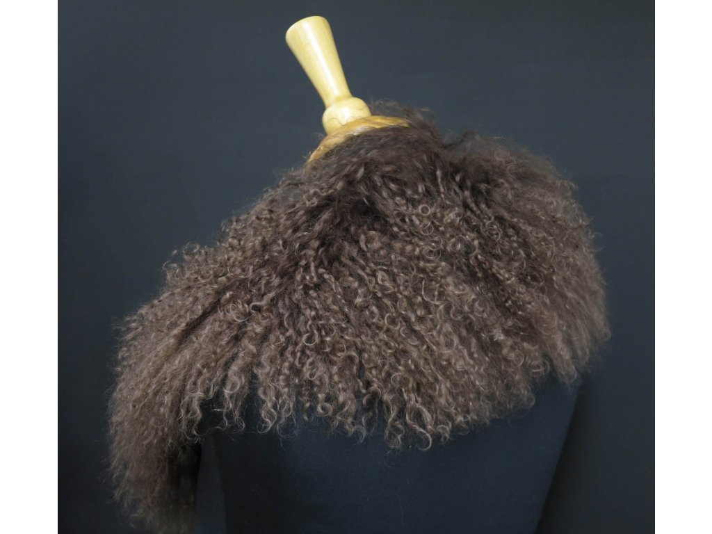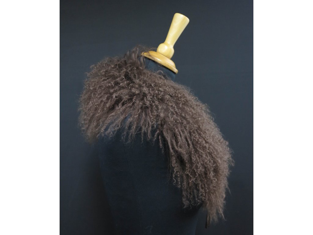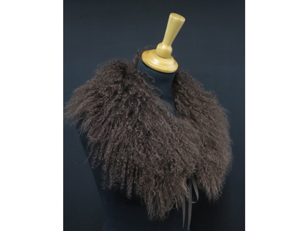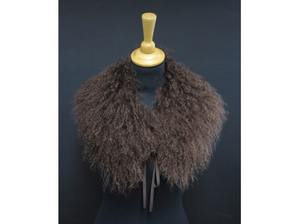 Krásný límec z barvené kožešiny tibetské ovce v neutrální hnědé barvě.