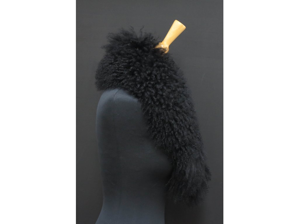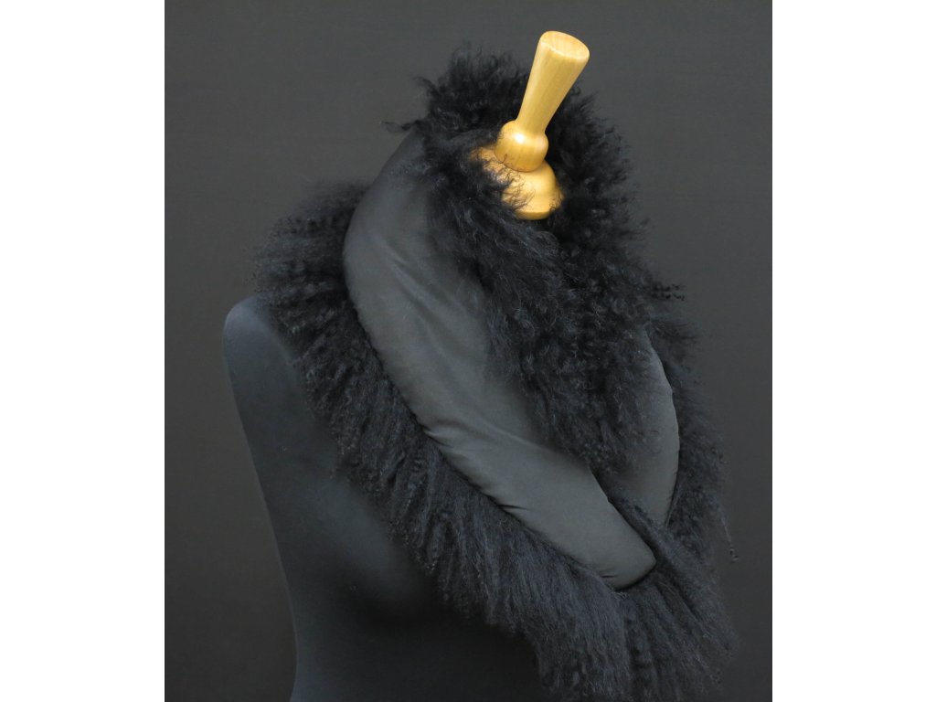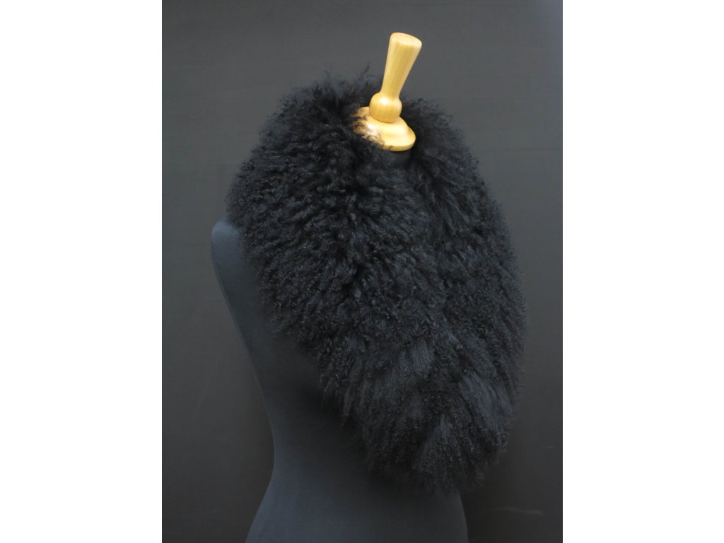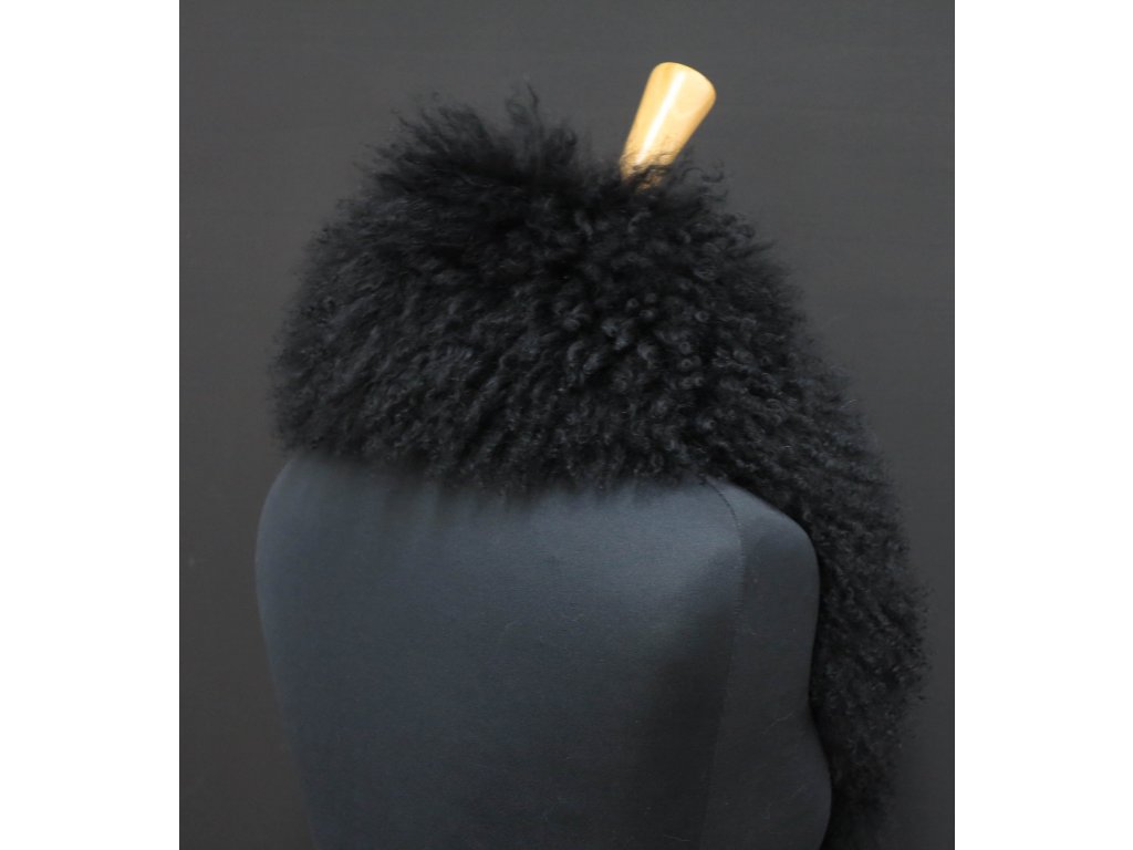 Větší šálový límec z kožešiny tibetské ovce, která se vyznačuje delší kudrnatou srstí a díky tomu krásně splývá a dotváří fazónu.