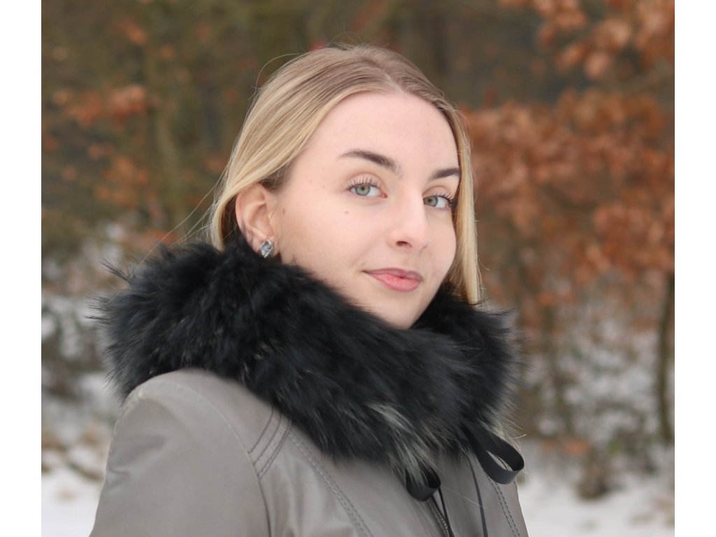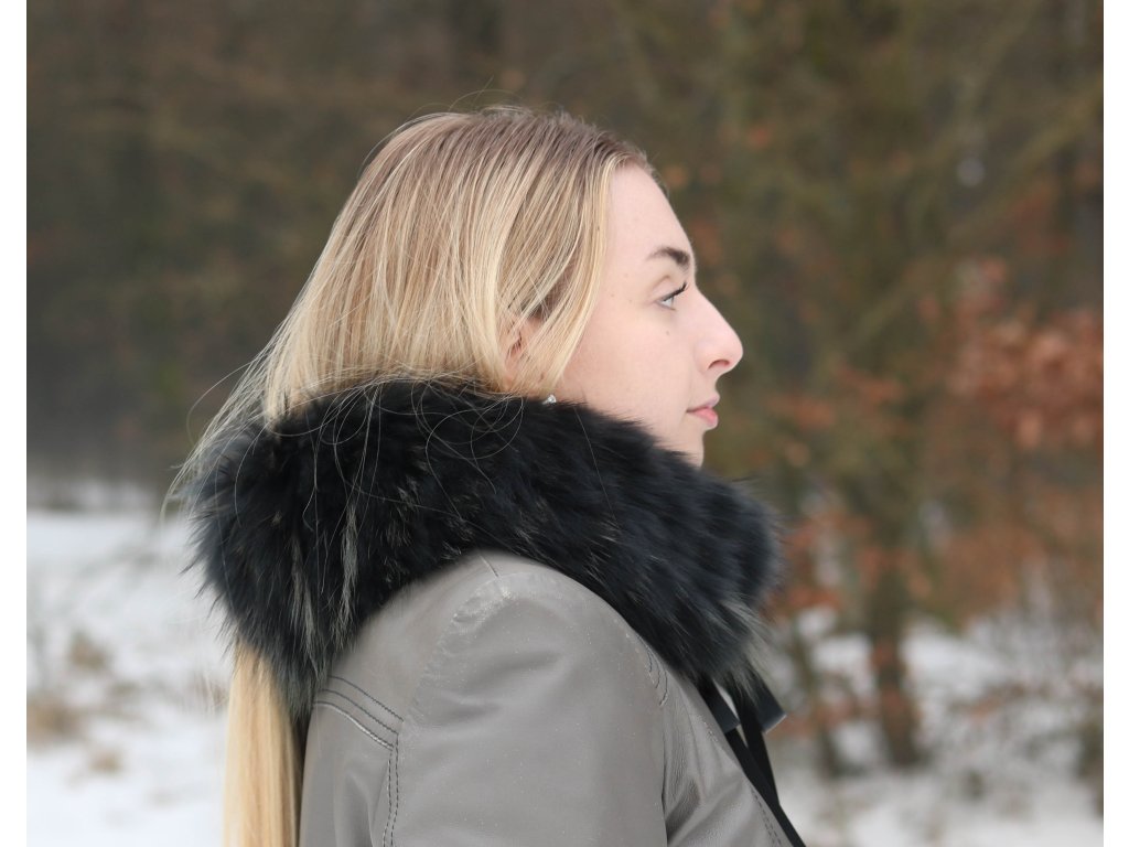 Luxusní kožešinový límeček je vyroben z pravé kožešiny mývalovce v zajímavém odstínu černé s hnědošedými prosvětlenými konci vlasu.