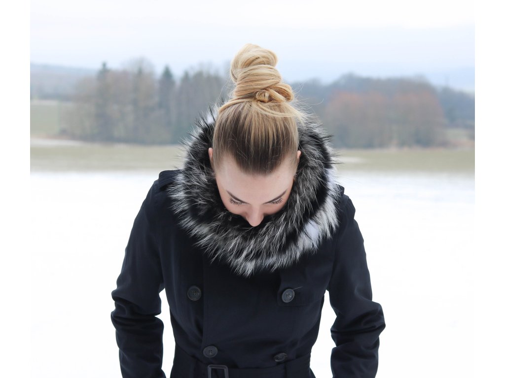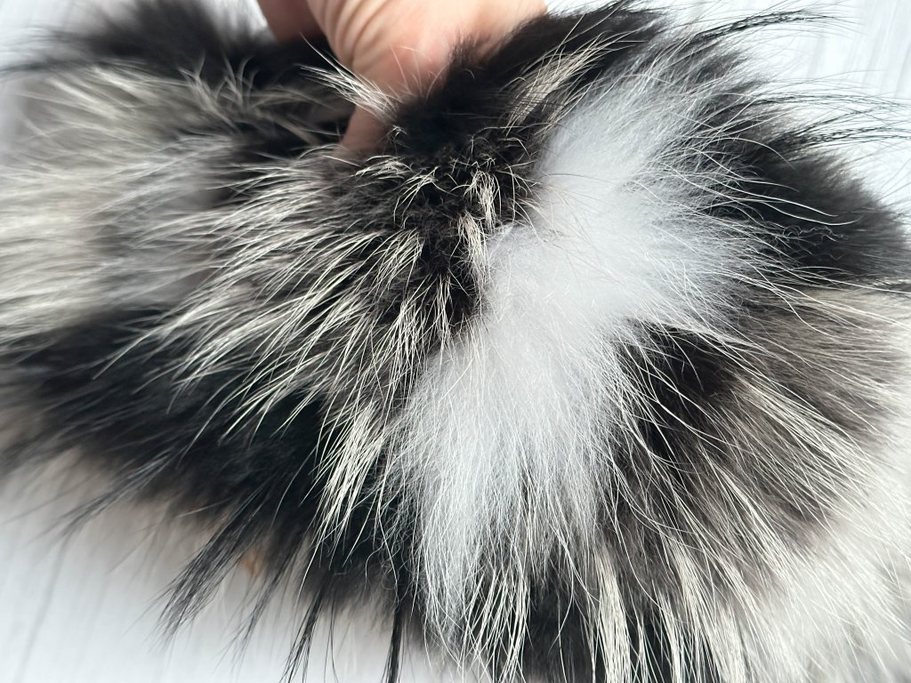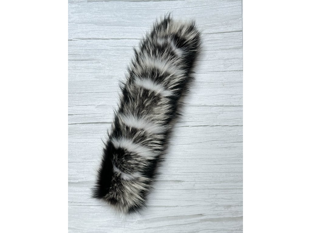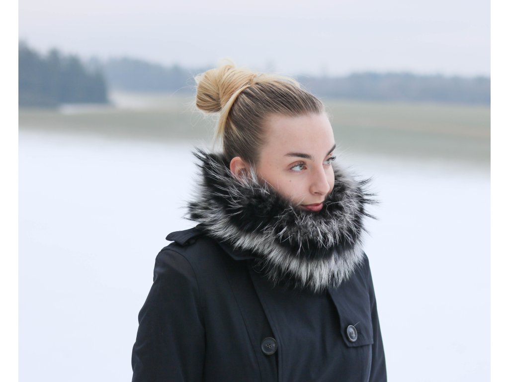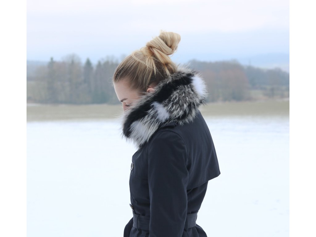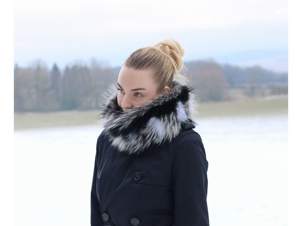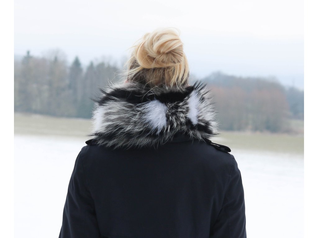 Výraznější, ale stále elegantní límec z pravé kožešiny finského mývalovce zaujme na první pohled svou hravou strukturou. Je sešitý z různobarevných kožešinových segmentů, díky čemuž působí živě, bohatě a lehce střapatě.