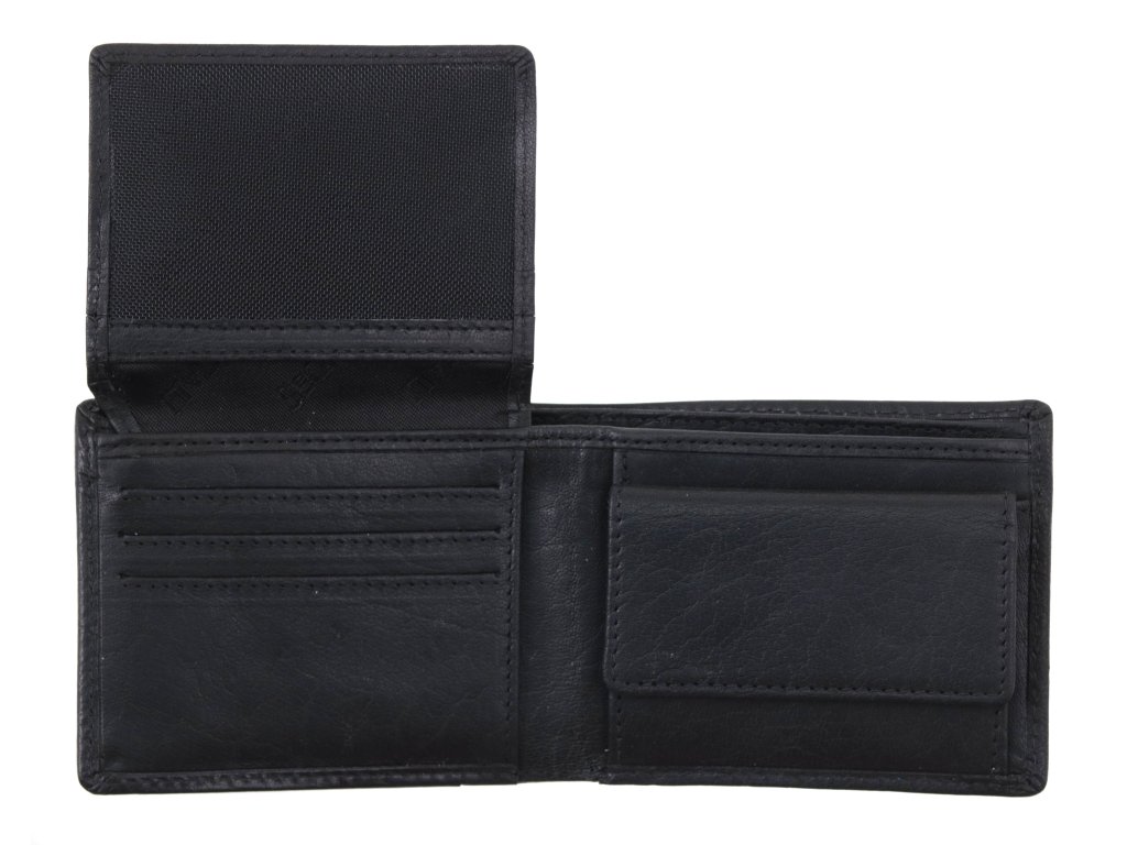 Kontrastní prošívání a ražené logo podtrhují elegantní vzhled, zatímco uvnitř nechybí dostatek prostoru pro bankovky, karty i doklady.