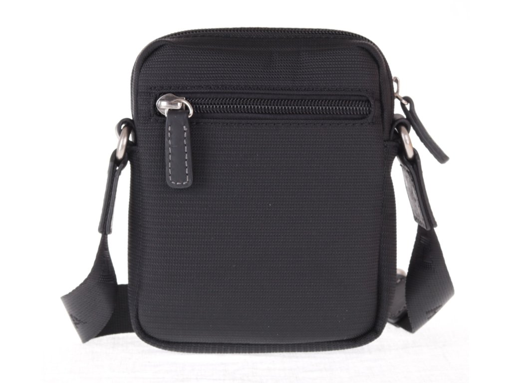 Pánská crossbody taštička z otěruvzdorného nylonu (Cordury) s koženou klopnou a nastavitelným ramenním popruhem. Taška se nosí křížem přes tělo nebo jen přes rameno.