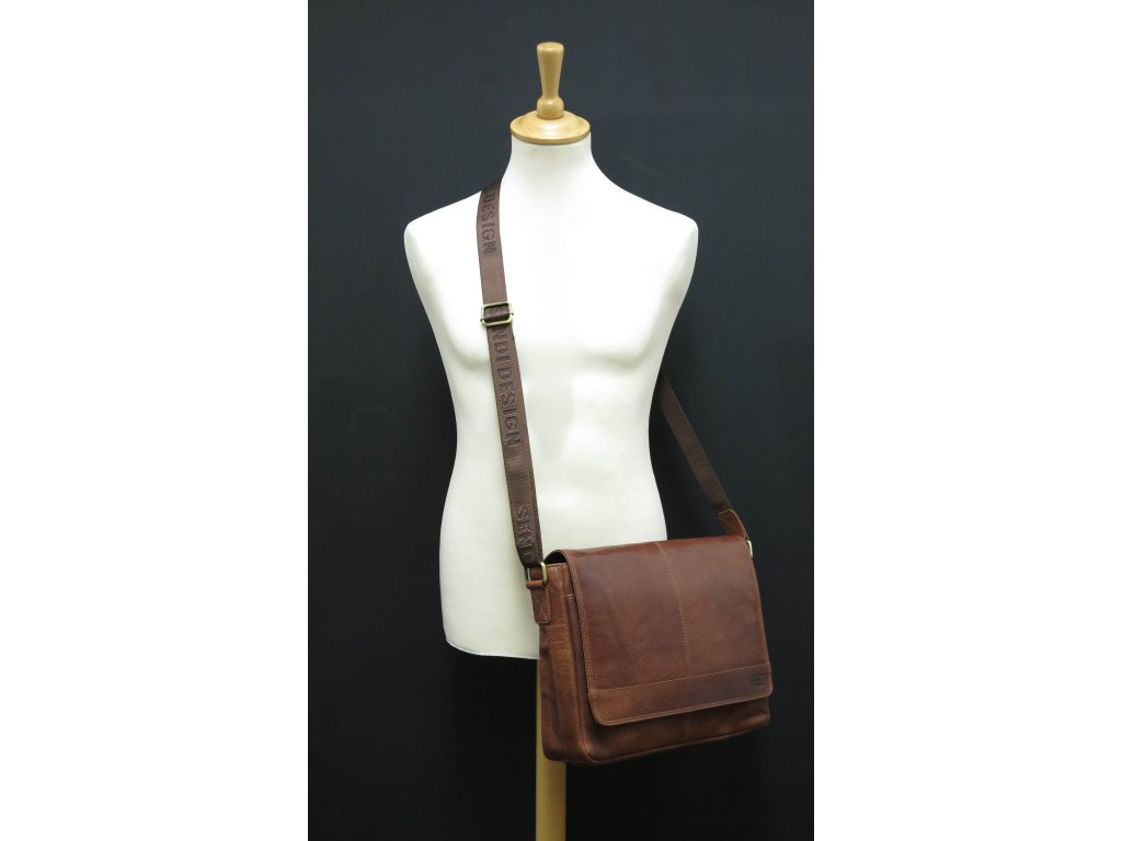 Pánská messenger taška z hladké hověziny v koňakově hnědé barvě s nastavitelným ramenním popruhem. Taška se nosí křížem přes tělo nebo jen přes rameno.