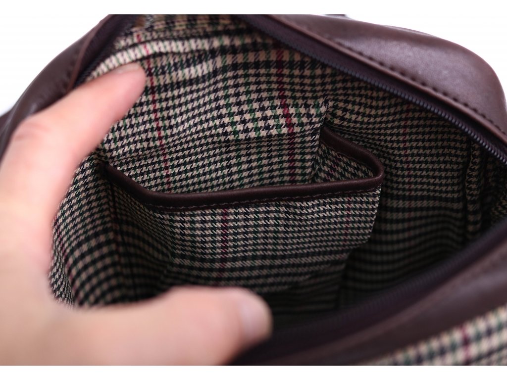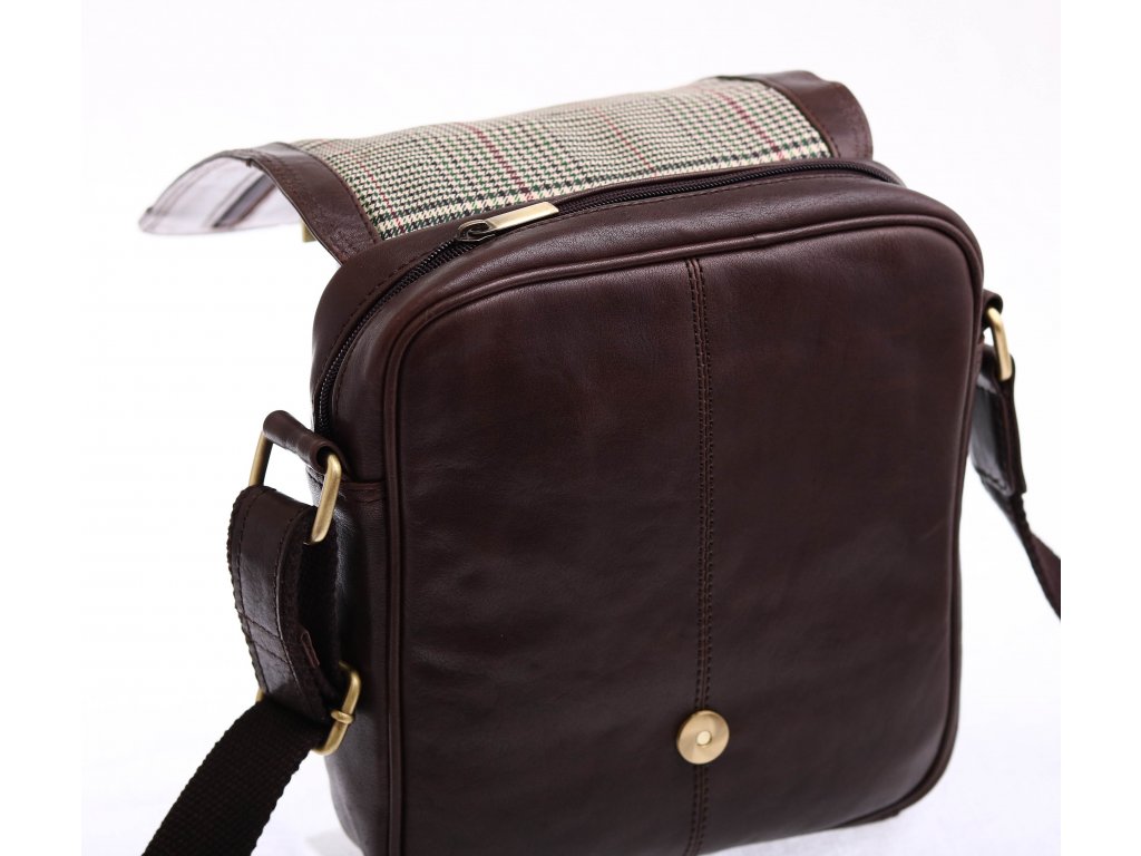 Pánská crossbody taška z hladké hověziny v černé barvě s károvanou podšívkou. Taška se nosí křížem přes tělo nebo jen přes rameno.