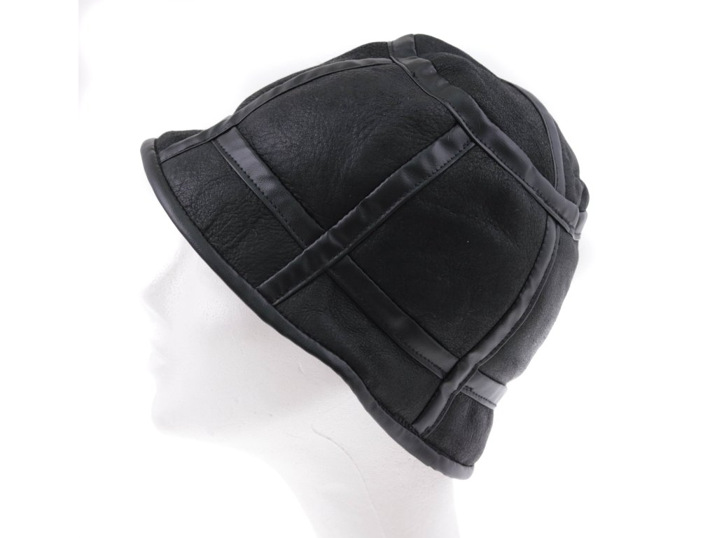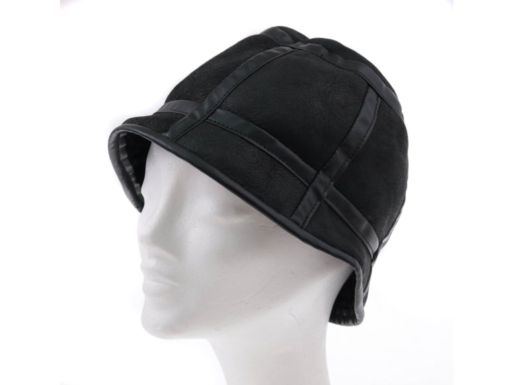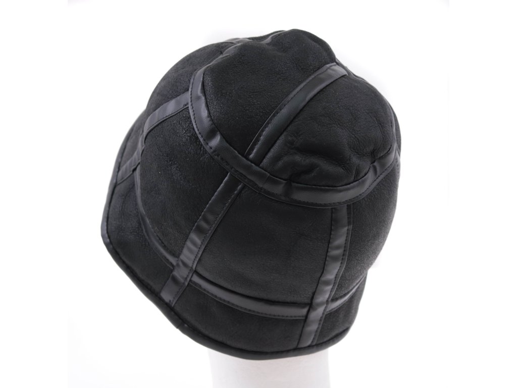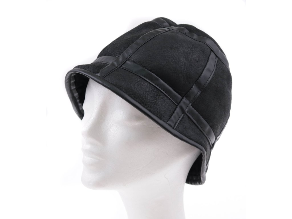 Zimní klobouček z ovčiny s výraznými pásky z koženky. Univerzální střih, může se nosit jako dámský nebo pánský. Je lehký, pohodlný a skvěle zahřeje – ideální do města, na procházky i na hory.