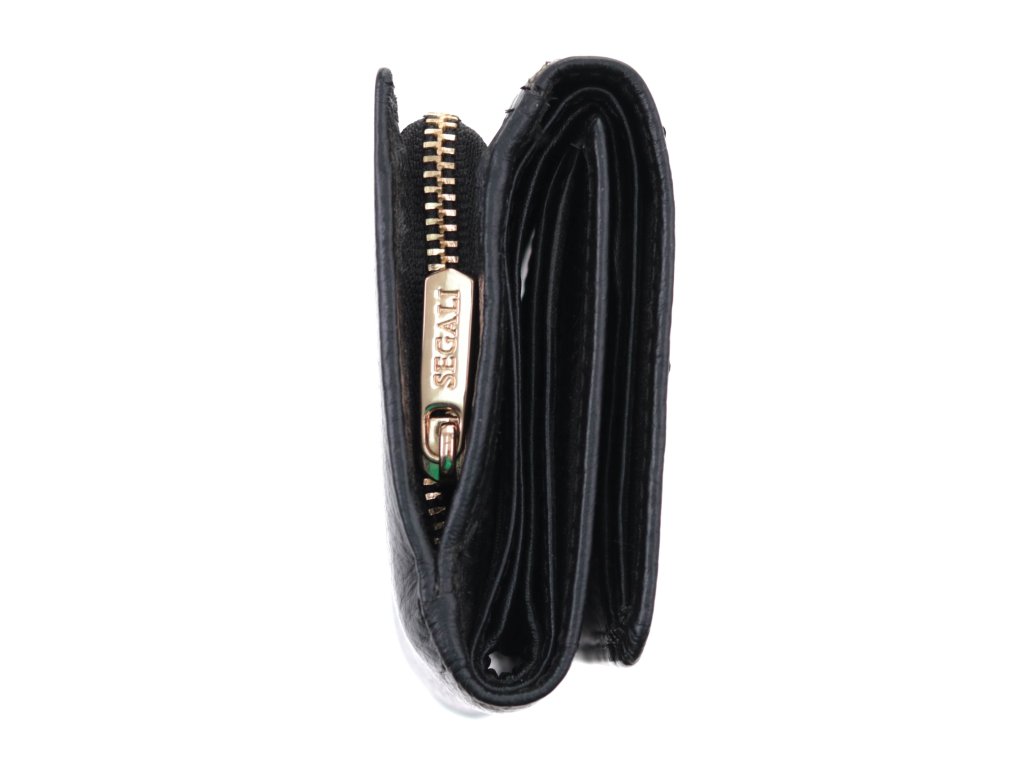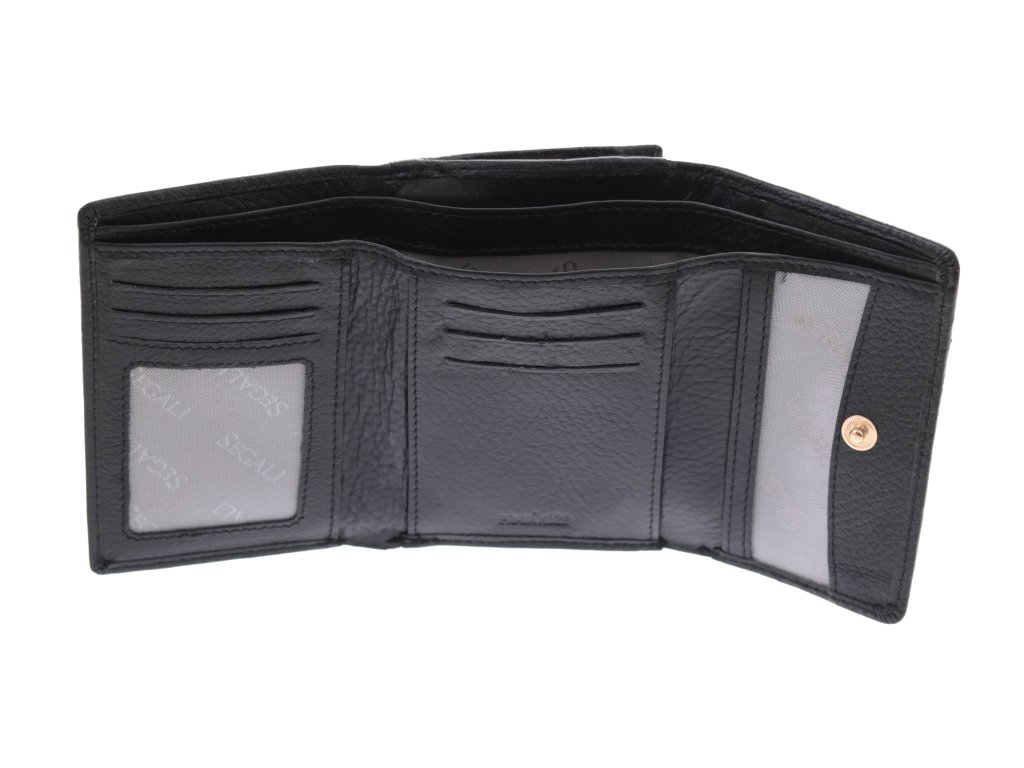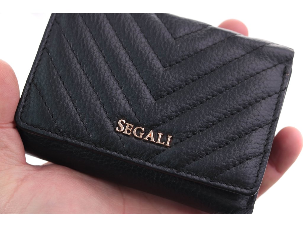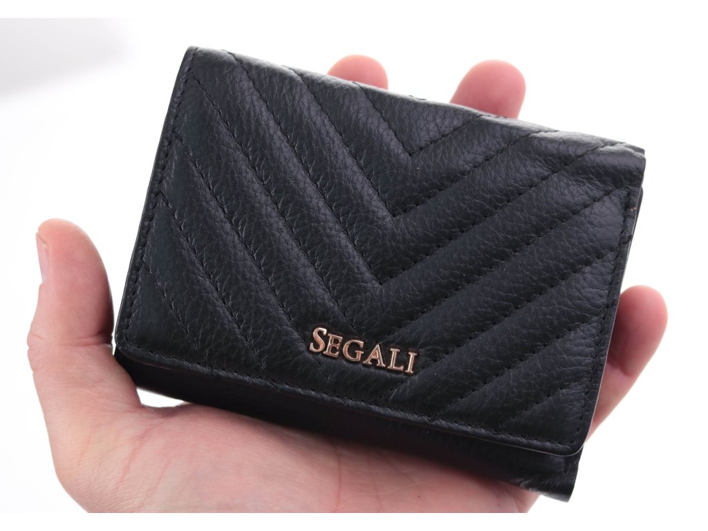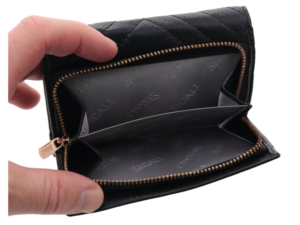 Zaujímavá kožená peňaženka Segali je zhotovená z jemnej a na dotyk príjemnej hovädzej usne. Na tejto dámskej peňaženke najviac zaujme jej prešívaná povrchová úprava. Oceníte vonkajší mincovník na zips a dva patenty pre možnosť zapnutia aj preplnenej peňaženky. Kovové doplnky v zlatej povrchovej úprave sú taktiež aktuálnym trendom.