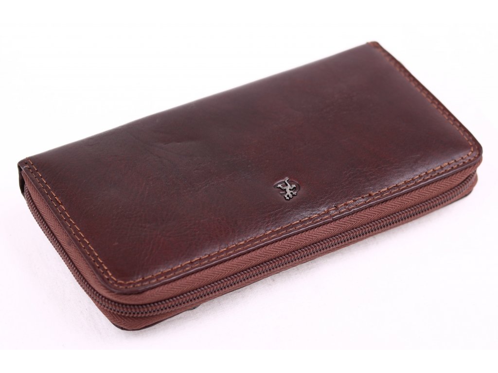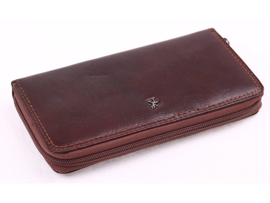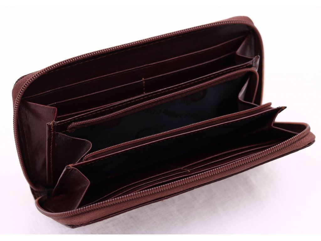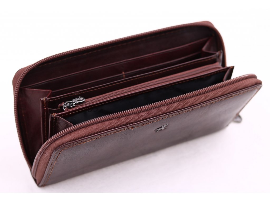 Luxusná veľká kožená peňaženka na zips v elegantnej hnedej farbe prekvapí prehľadným usporiadaním a veľkým množstvom priehradiek pre vaše doklady a rôzne karty. Prednosťou tejto dámskej koženej peňaženky je jej tvar peračníka a zips, ktorý zaisťuje okamžitý prístup k vašim peniazom a dokladom. Kvalitná talianska veľmi odolná hovädzina pri peňaženkách Cosset samozrejmosťou.