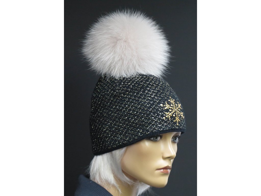 Dámska čiapka s kožušinovým brmbolcom z líšky 601 čierna + zlatý lurex