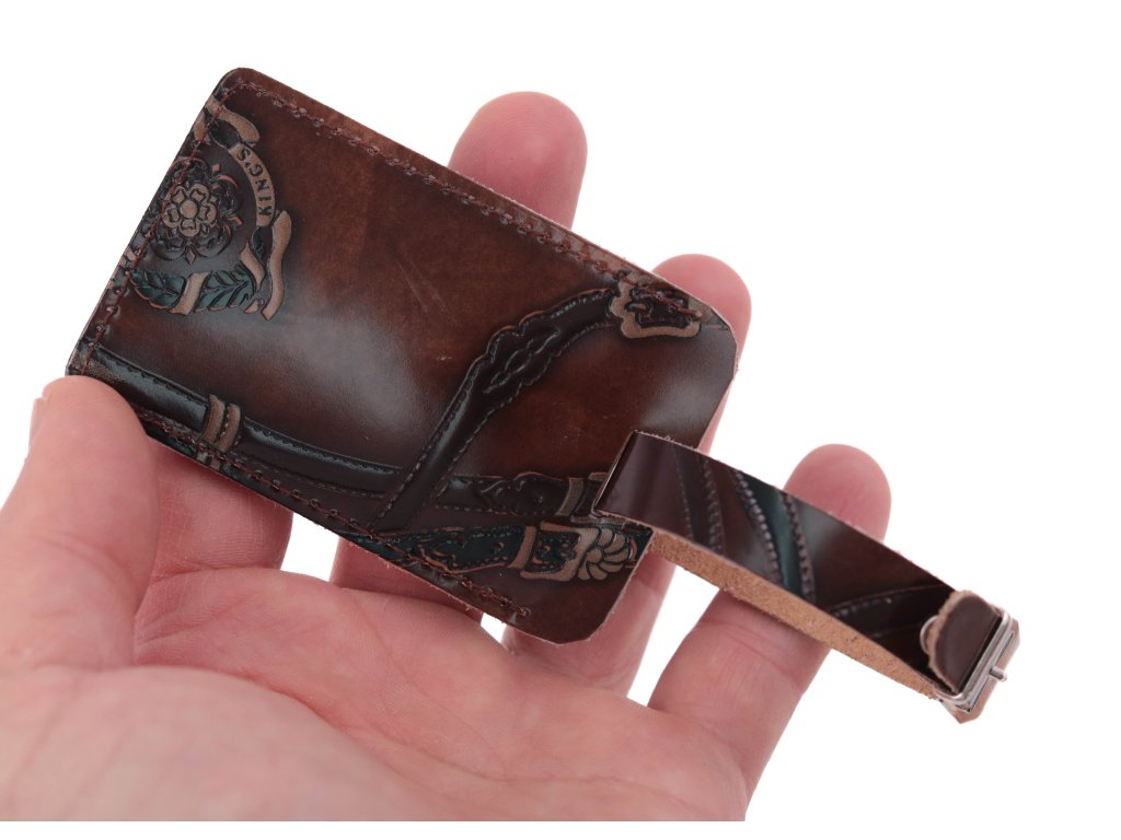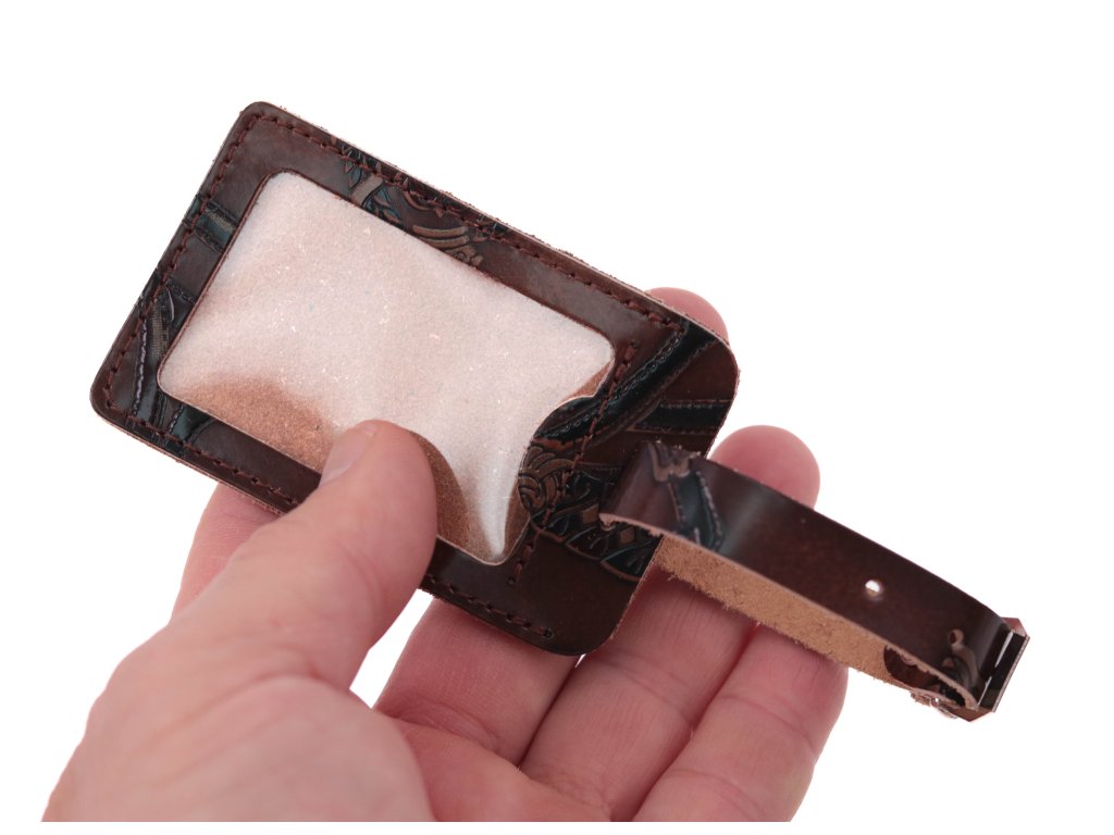 Kožená menovka väčších rozmerov slúži na pripnutie adresy na vašu cestovnú batožinu. Je vyrobená z hovädzej usne a obsahuje priehľadné okienko kryté fóliou, do ktorého vložíte vašu adresu. Okienko je kryté koženou chlopňou proti poškodeniu. Český výrobok aj materiál.