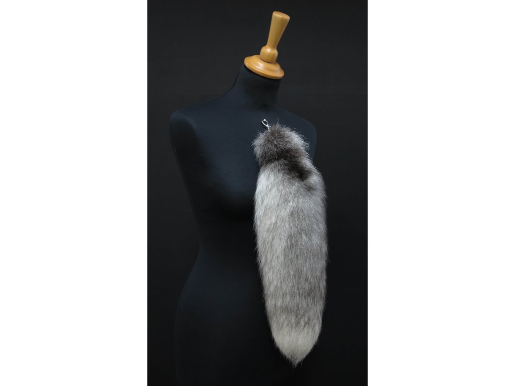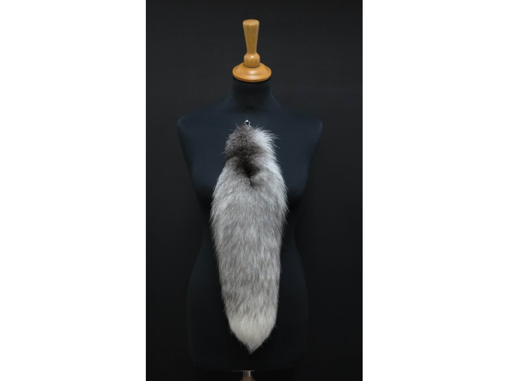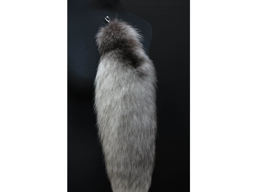 Výnimočný kožušinový chvost z pravej líšky Frost vo svojej prírodnej farbe vo svetlo šedej farbe.