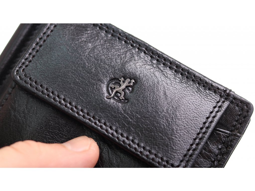 Perfektne vybavená pánska kožená peňaženka typu "dolárovka" na dĺžku z kvalitnej hovädziny od tradičnej značky Cosset. Prednú stranu peňaženky zdobí kovové logo radu Komodo – jašterica.
