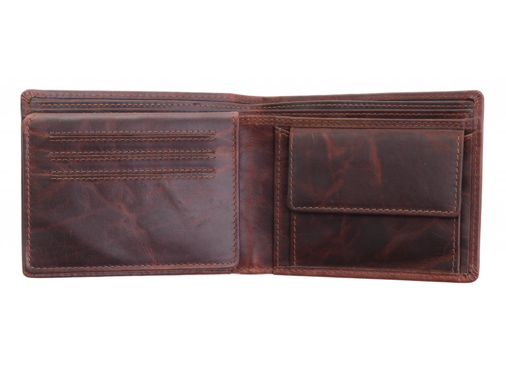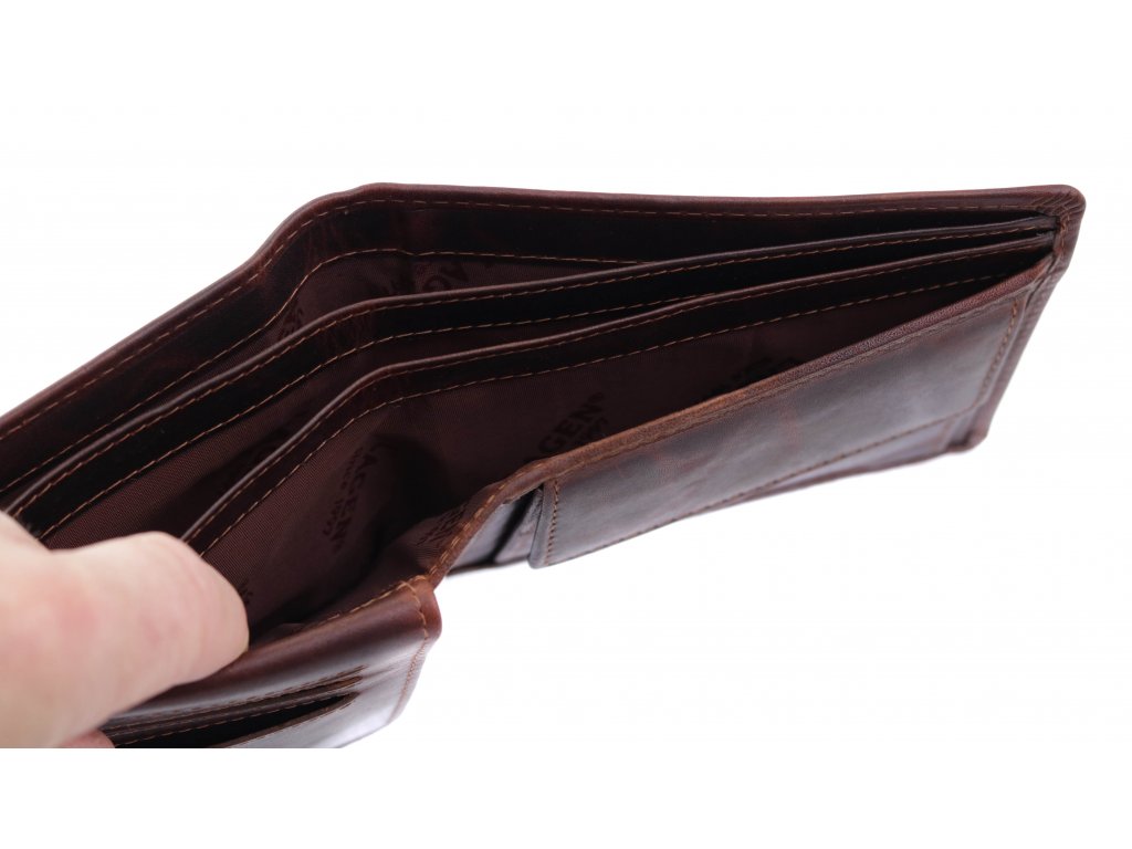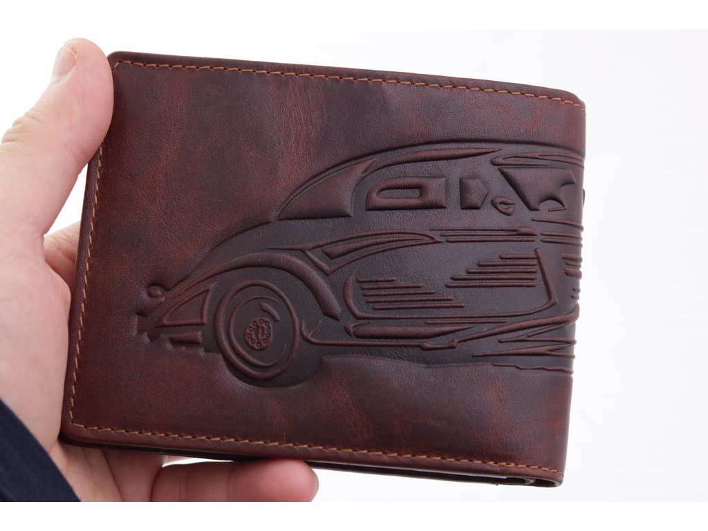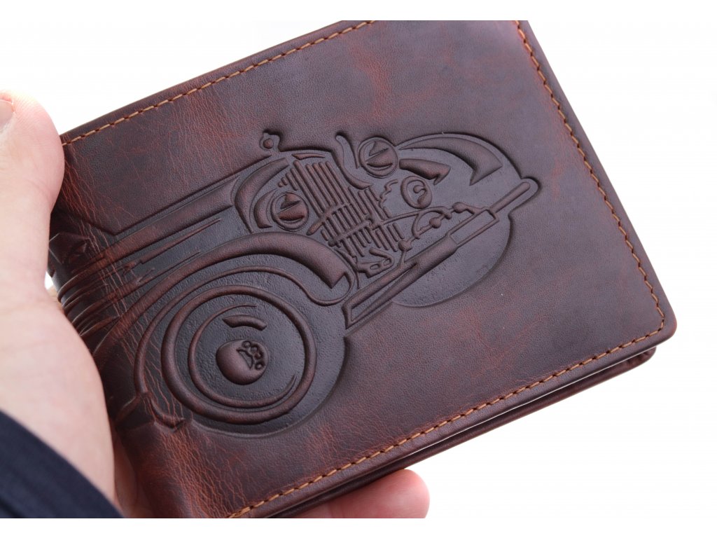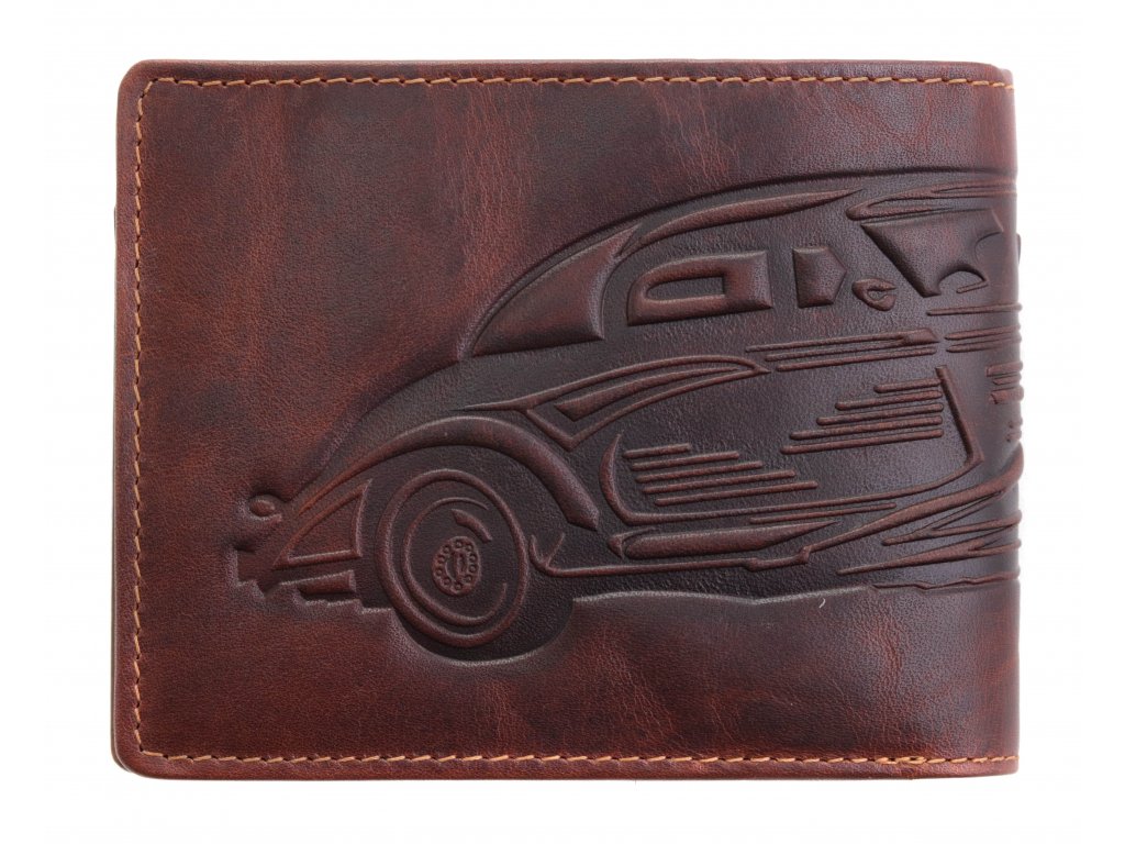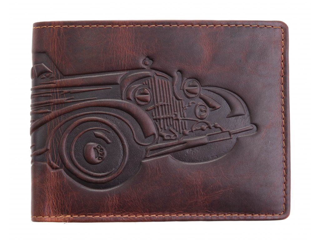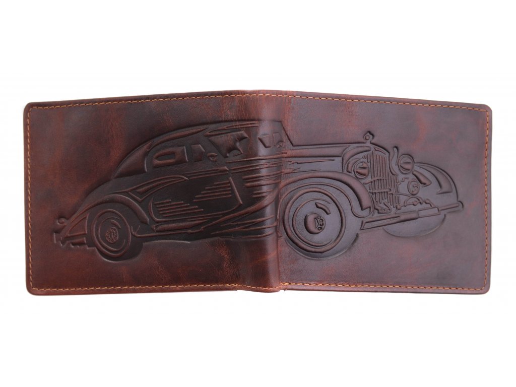 Pánska kožená peňaženka s vytlačovaným motívom starého auta (veterána) je vyrobená z kvalitnej hovädzej anilínovej kože. Efektné prešívanie a výrazný vzor robí z tejto peňaženky krásny darček. Vybavená a praktická - to charakterizuje túto koženú peňaženku otvárajúcu sa na šírku.