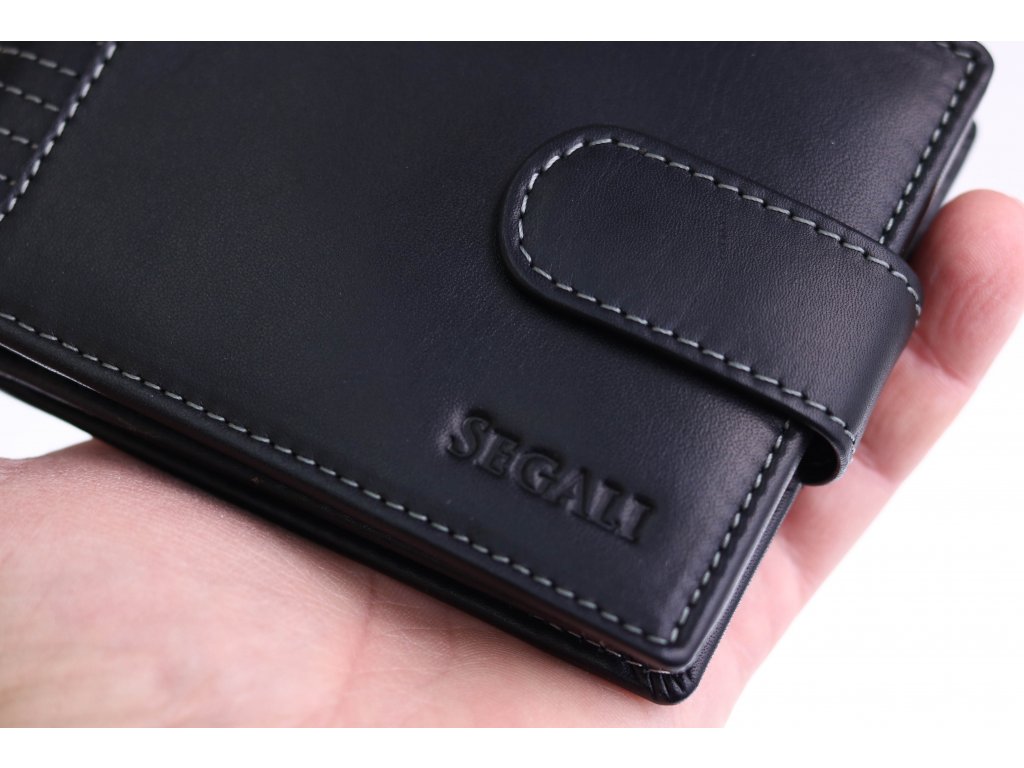 Vybavená a praktická pánska kožená peňaženka z kvalitnej hovädziny pohodlne pojme veľké množstvo dokladov a kariet. Peňaženky od značky Segali prekvapia výborným pomerom kvality a ceny. Prednú stranu tejto na šírku orientované peňaženky zdobí kovové logo výrobcu. Peňaženku obdržíte v originálnej pevnej papierovej krabičke od výrobcu.