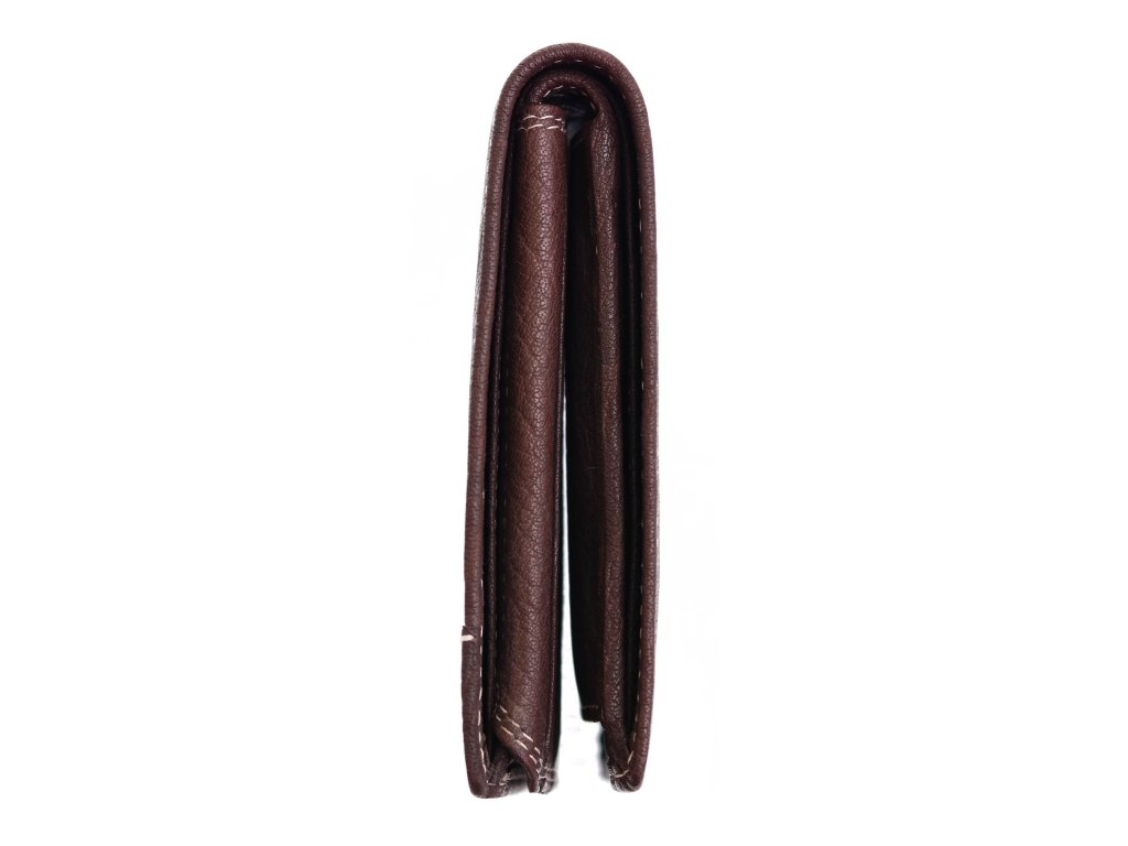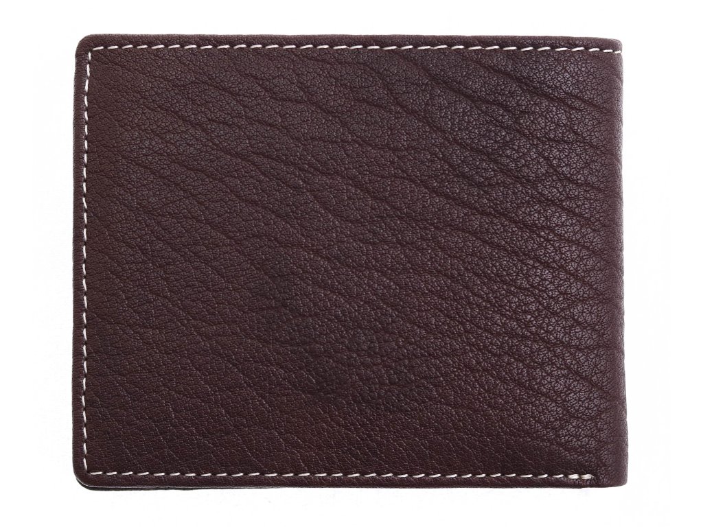 Peňaženka je zhotovená z krásnej hovädzej usne s výraznou hrubšou štruktúrou. Prednú stranu tejto na šírku orientovanej peňaženky zdobí logo výrobcu.
