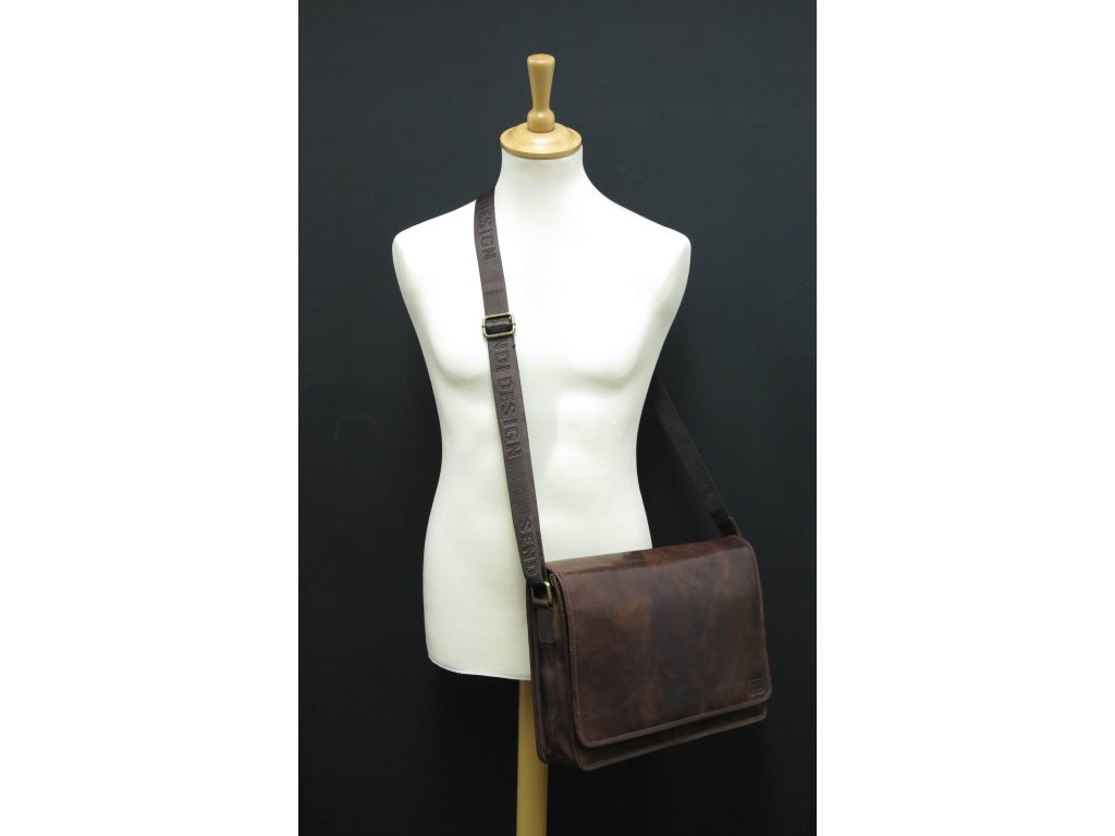 Pánska messenger taška z hladkej hovädziny v hnedej farbe s nastaviteľným ramenným popruhom. Taška sa nosí krížom cez telo alebo len cez rameno.